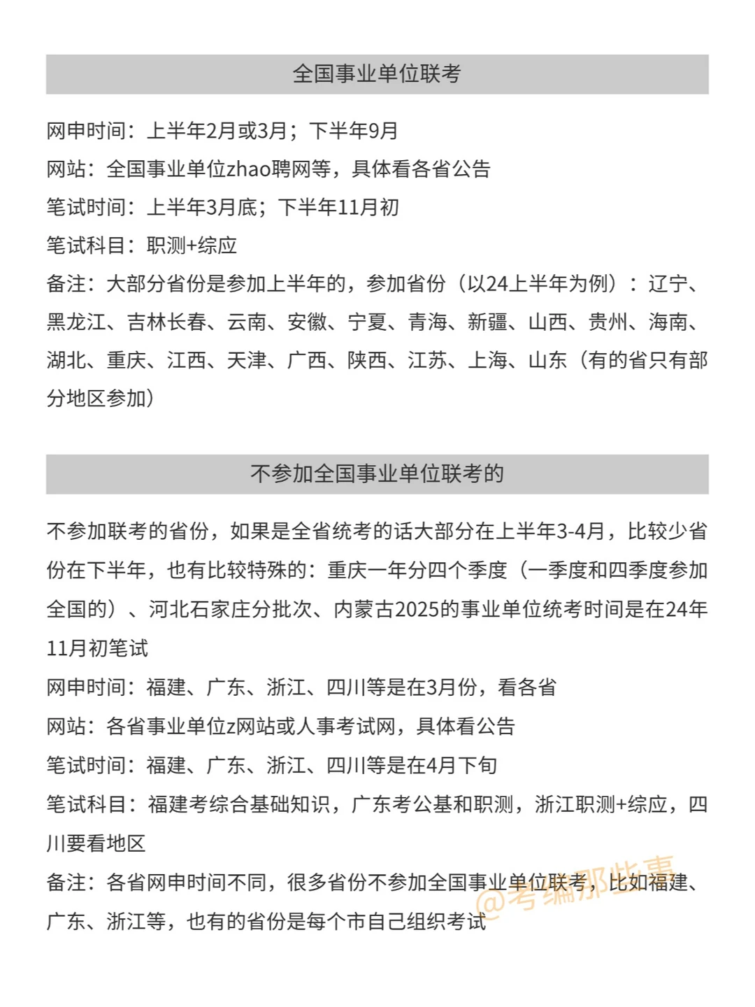 如果是全省统考的话大部分在上半年3-4月,比较少省份在下半年,也有比较特殊的:重庆一年分四个季度(一季度和四季度参加全国的)、河北石家庄分批次、内蒙古2025的事业单位统考时间是在24年11月初笔试