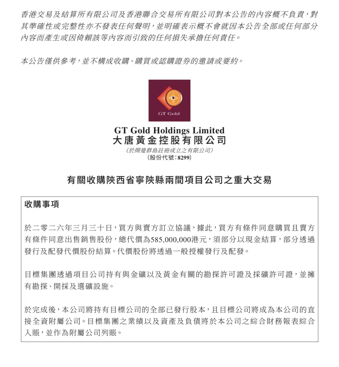 大唐黄金控股有限公司(股份代号:08299.HK,以下简称 “大唐黄金” 或 “公司”)今日发布公告,宣布于 2026 年 3 月 30 日与国泰黄金投资控股有限公司(以下简称 “卖方”)订立收购协议,公司拟以5.85 亿港元的总代价,收购长盛联合投资有限公司(以下简称 “目标公司”)的全部已发行股本。公司股份已于今日(3 月 31 日)上午九时正恢复在香港联交所 GEM 买卖。