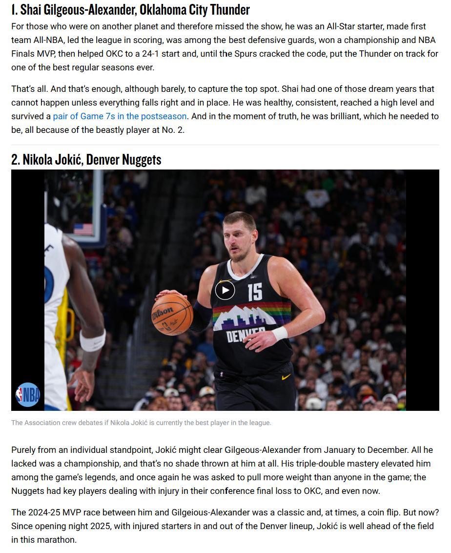 NBA官方最新一期MVP排行榜,还是约基奇第一,亚历山大第二,3-5位是东契奇、布伦森和文班亚马。作者对约基奇的评语最后提到:在这次受伤之前,他就是 MVP 头号热门,毫无悬念。也就只有这种级别的的意外,才让局势增添了一丝不确定性。而在2025年全年NBA最佳球员榜单中,同一位作者的排名是亚历山大第一、约基奇第二、爱德华兹第三,评语同样暗藏亮点。编辑by 蓝色狂潮OKC雷霆雷霆vs勇士2026nba全明星投票