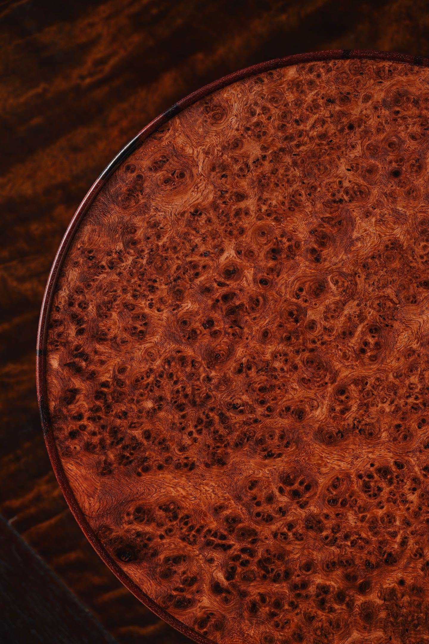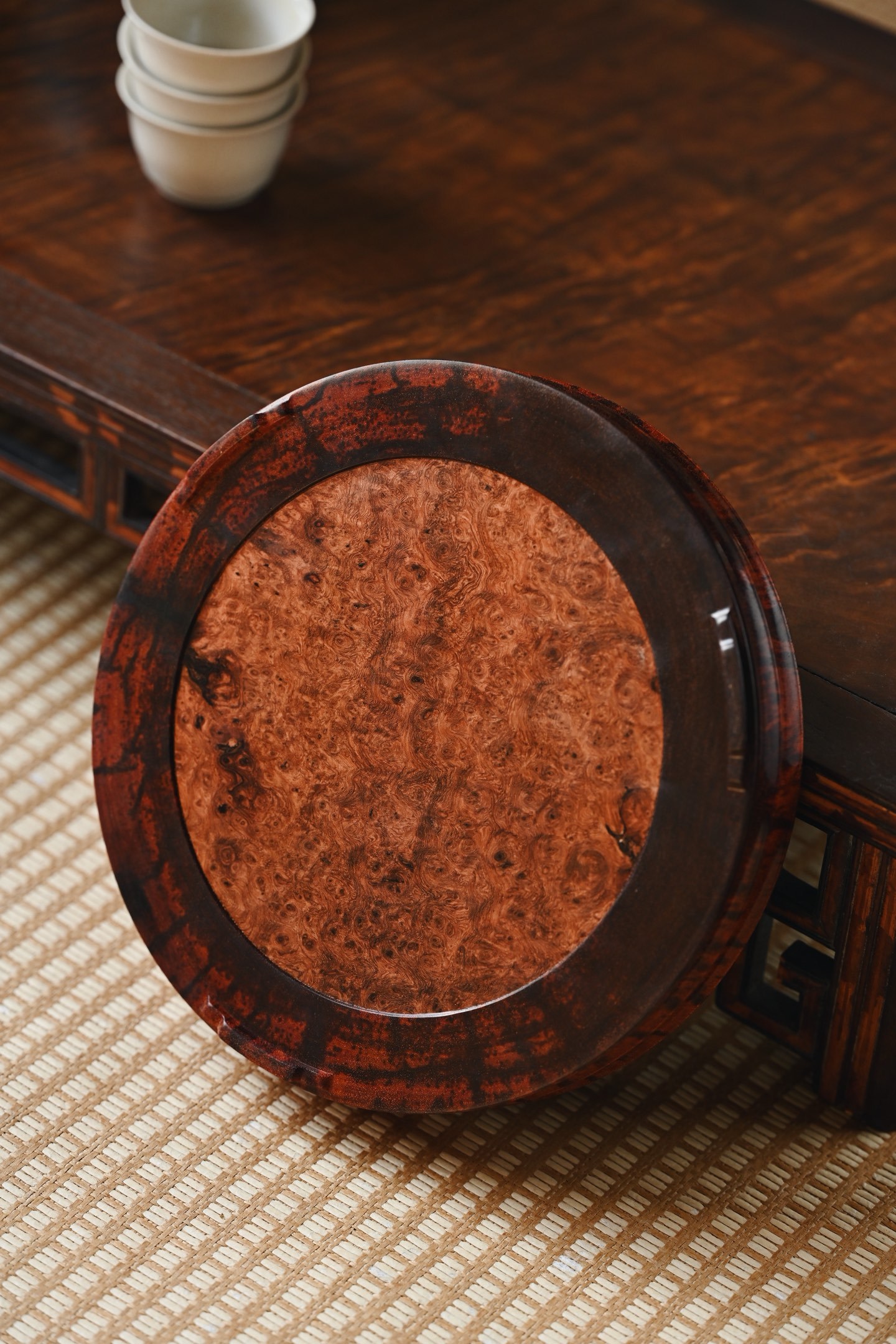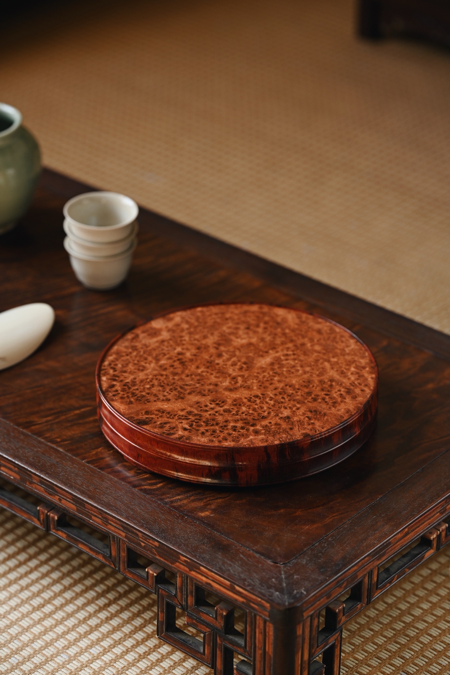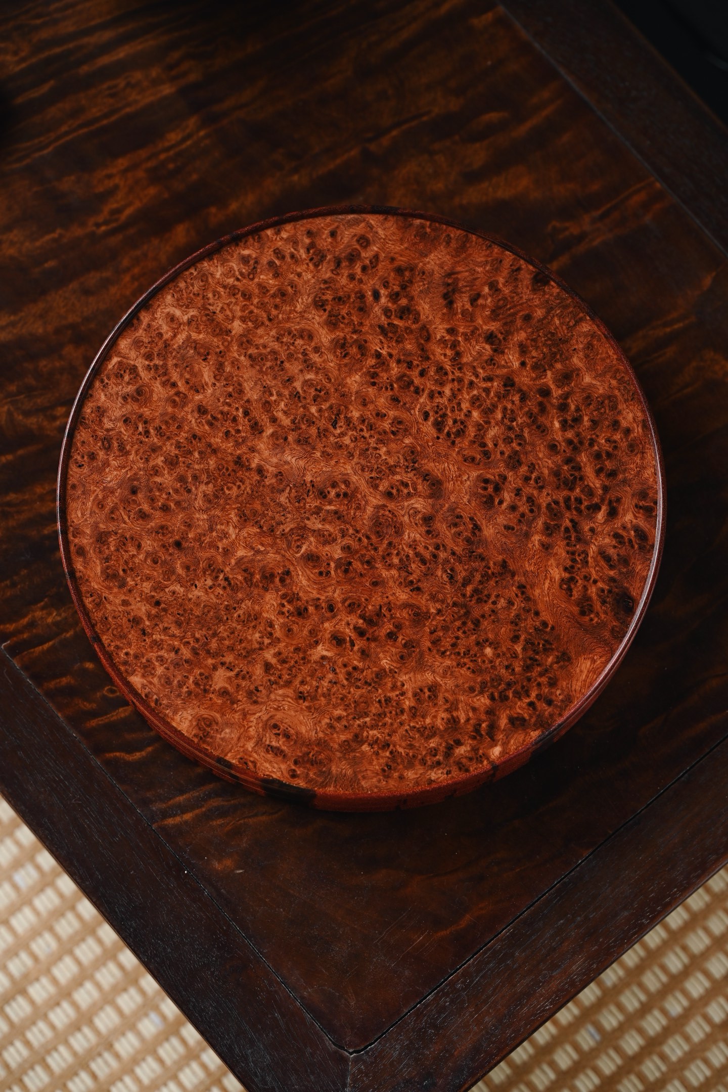 紫檀×缅花瘤疤 | 干泡、壶承、底座大口径,料质温润细腻,底座几面平坦,缅花纹理细腻,可作壶承,亦可承放雅玩、盆栽等,美感与实用兼顾。19.3*19.3*3.5cm 878g
