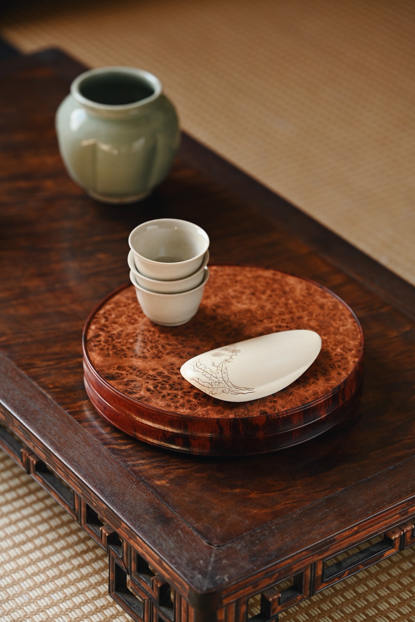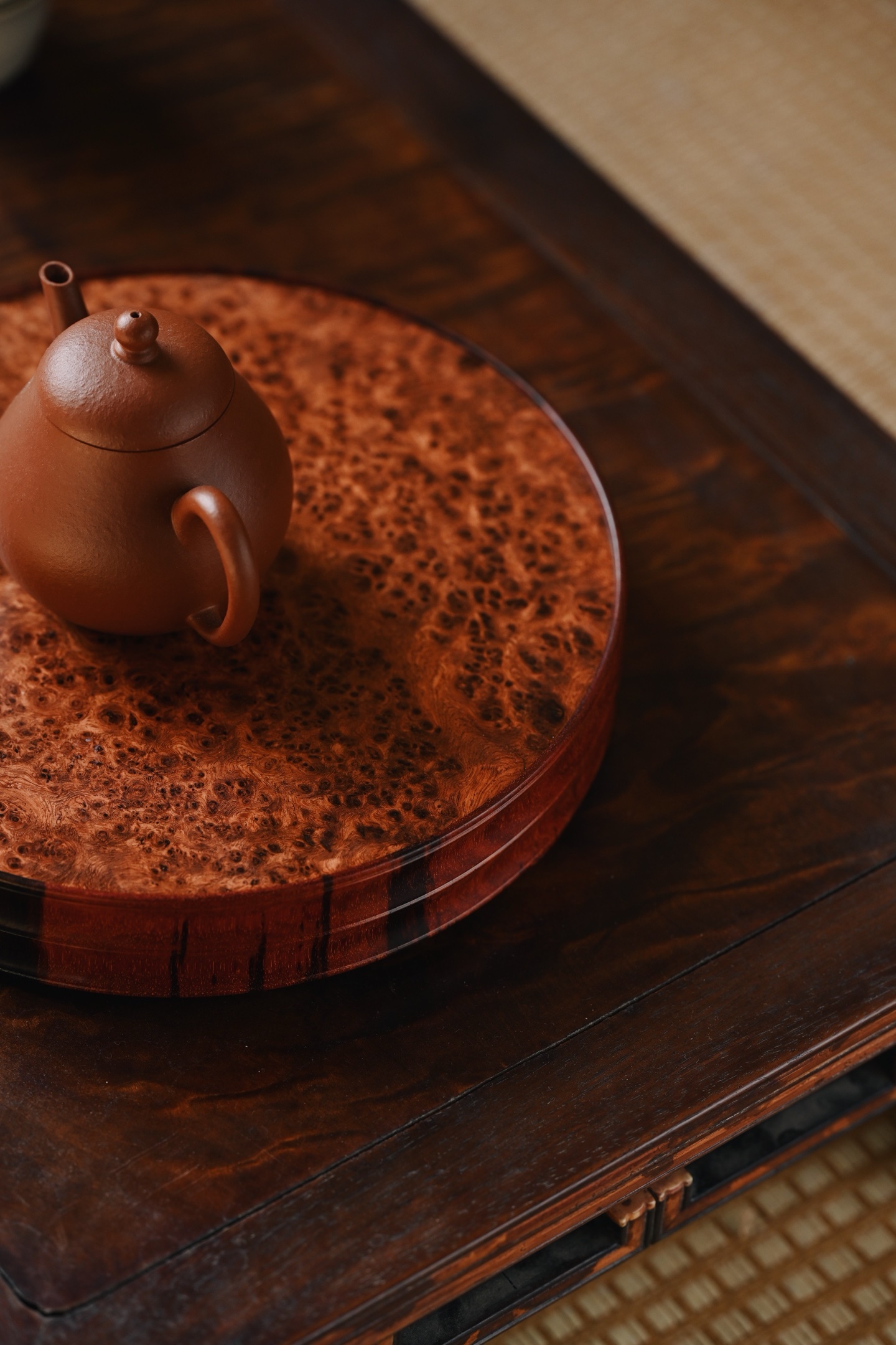 紫檀×缅花瘤疤 | 干泡、壶承、底座大口径,料质温润细腻,底座几面平坦,缅花纹理