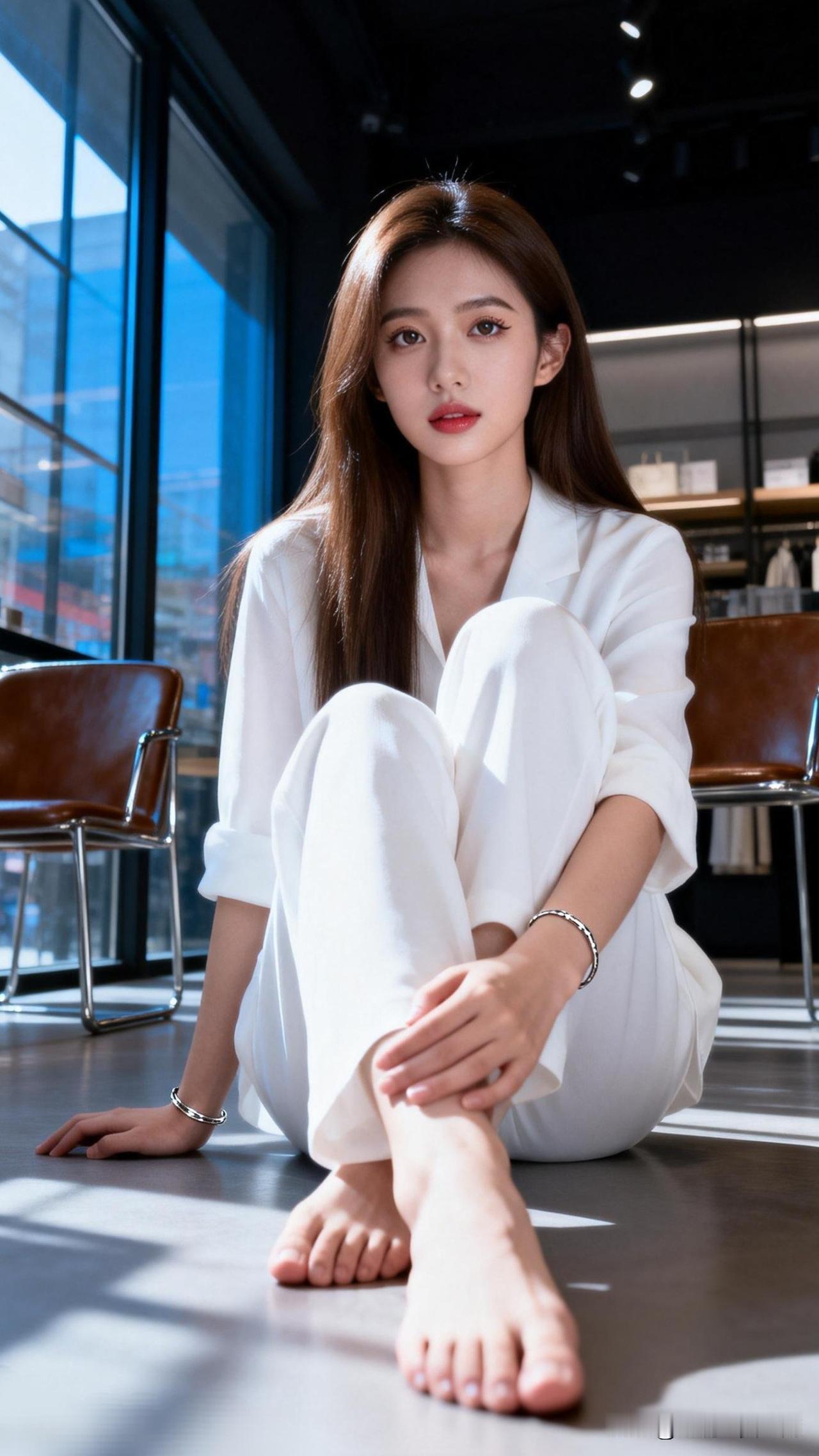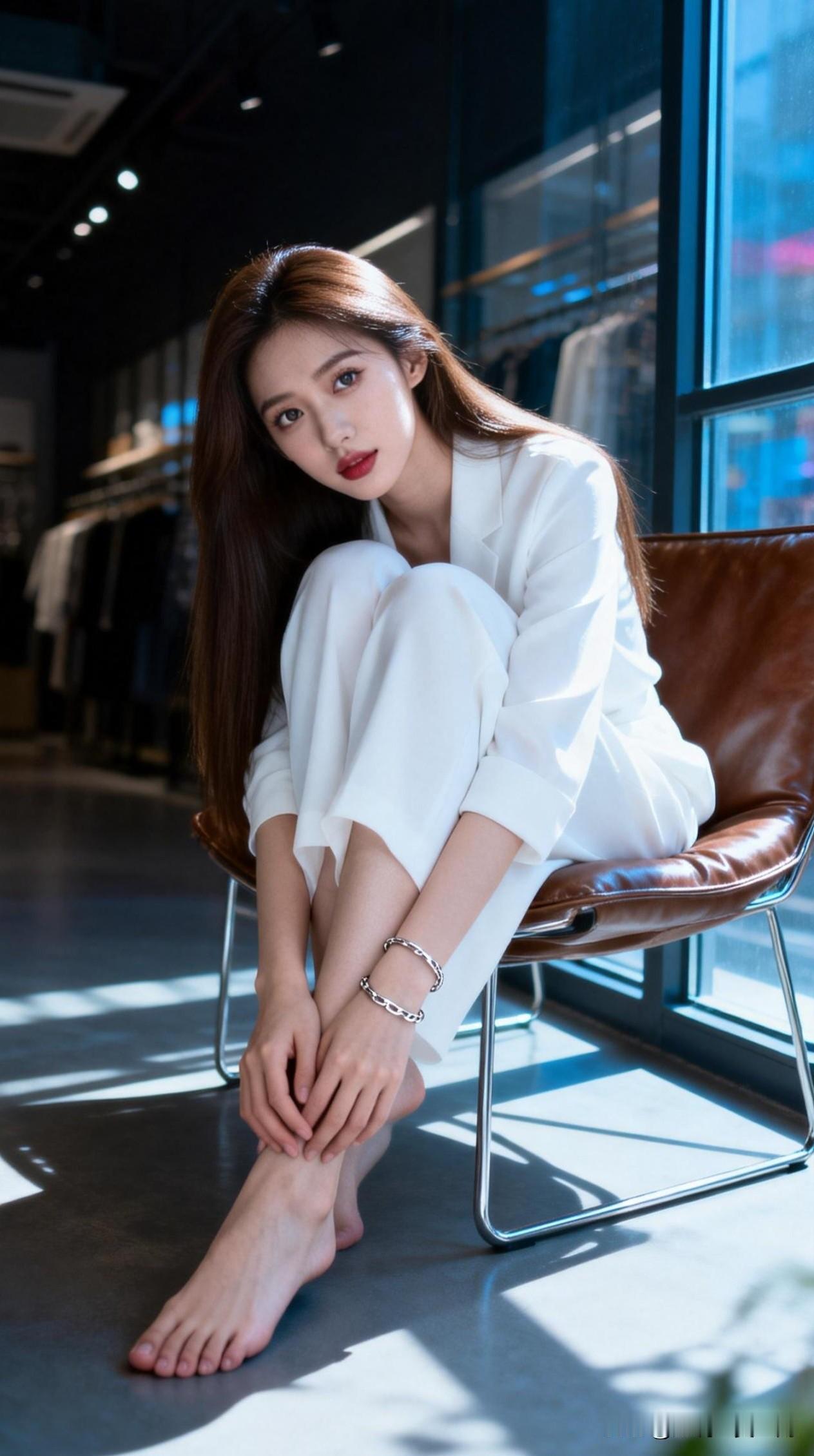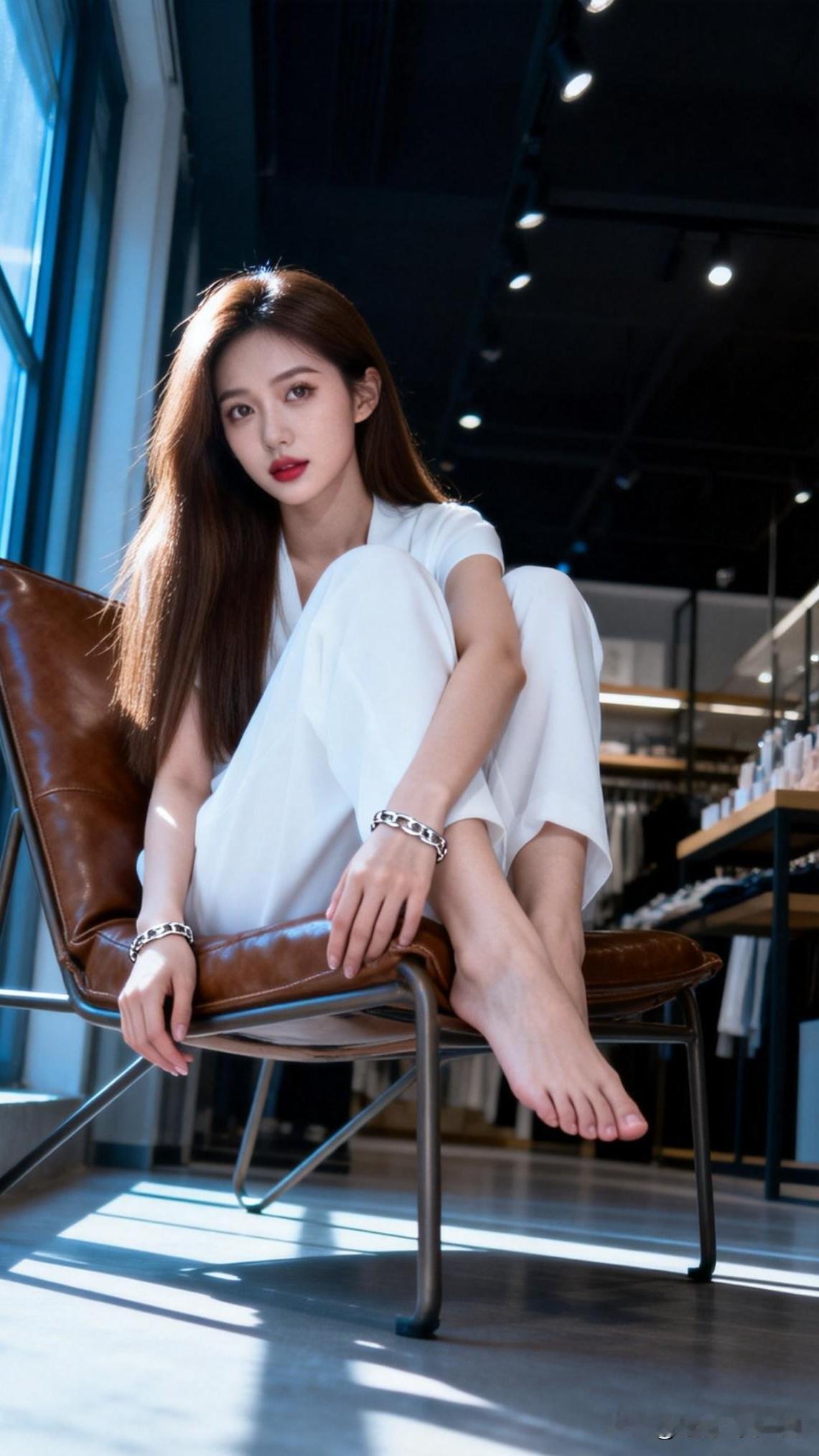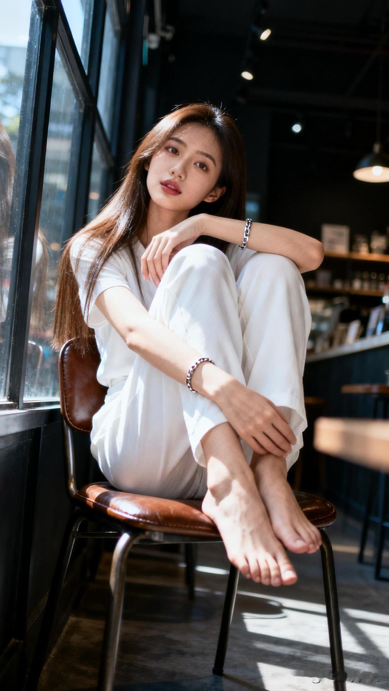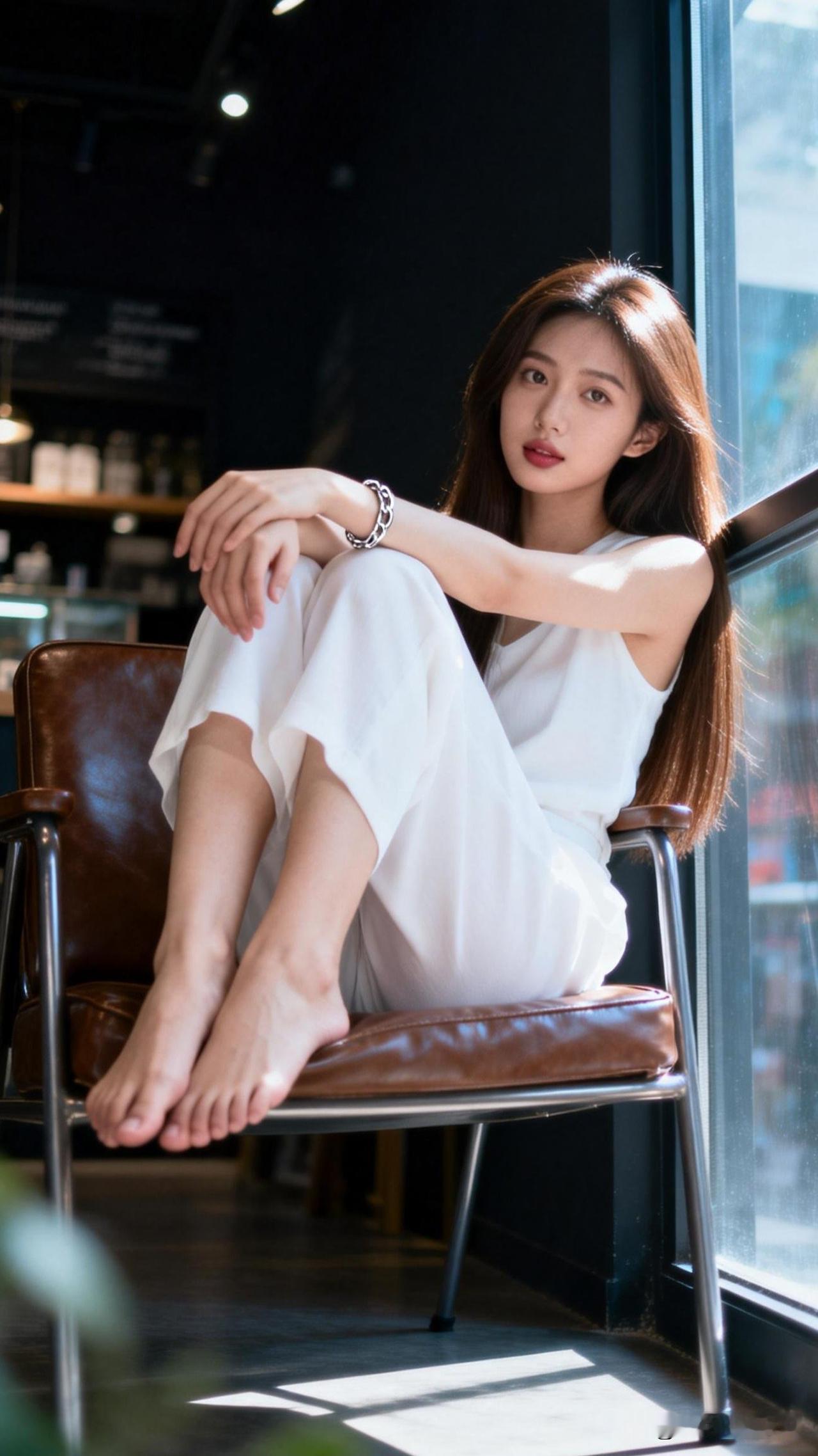 静坐窗前思,白衣映日辉。长腿为什么惹人喜欢呢 优雅白衣少女,静坐时尚空间,尽显自然之美。
