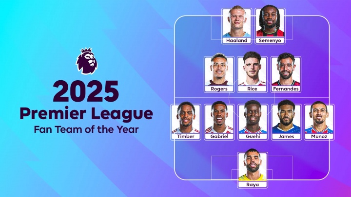 直播吧01月03日讯经过球迷票选后,英超官方确定2025年度最佳十一人阵容。