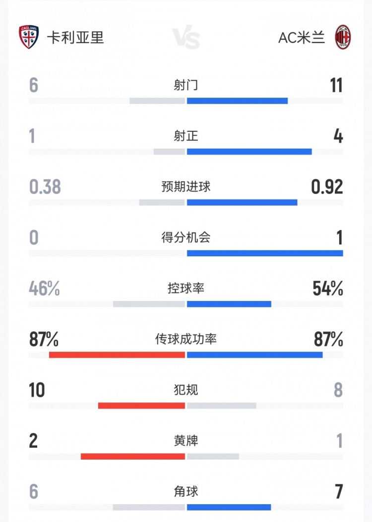 直播吧1月3日讯本轮意甲,米兰1-0客胜卡利亚里。双方全场重点数据对比如下↓(主队卡利亚里在前)