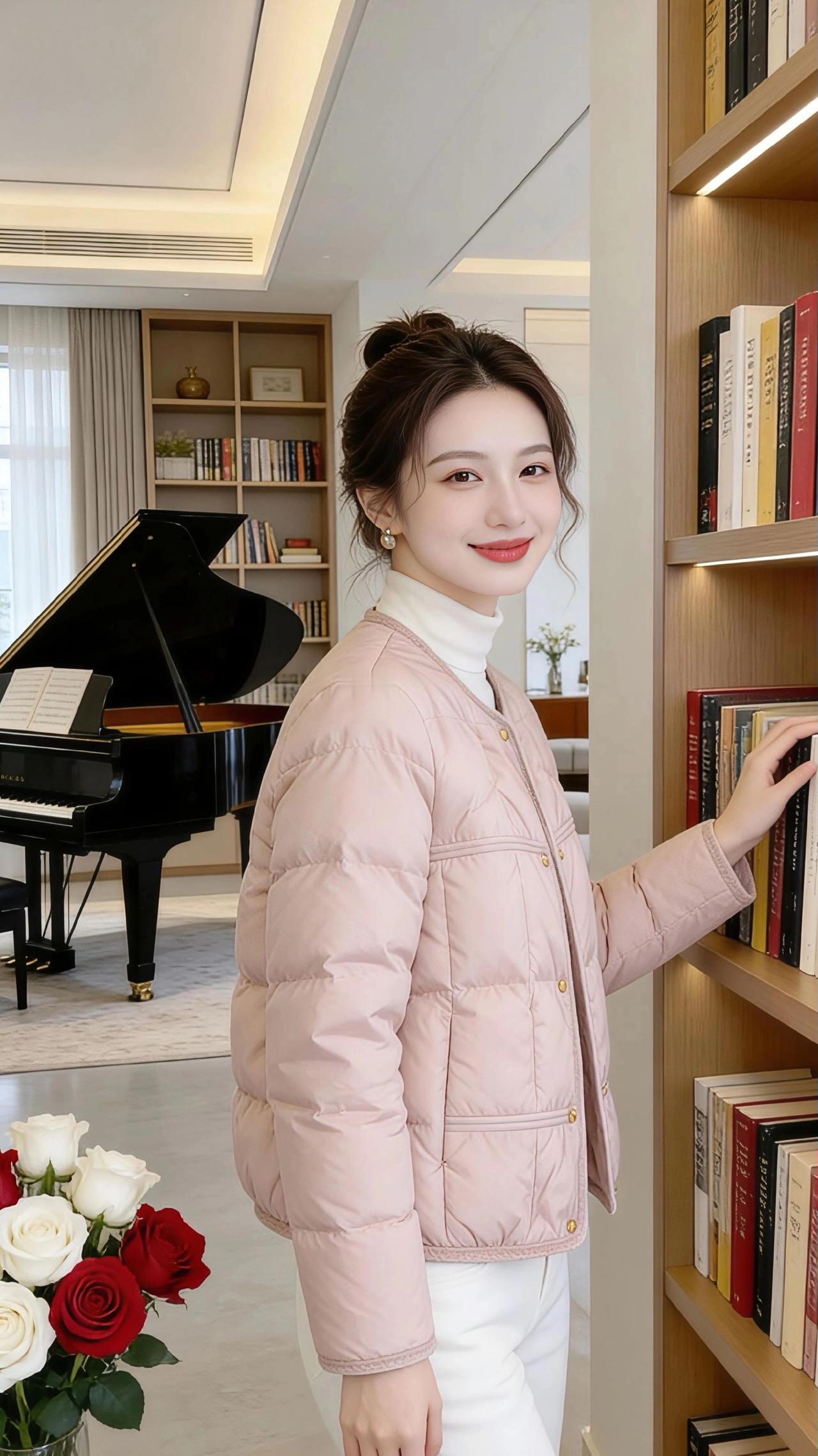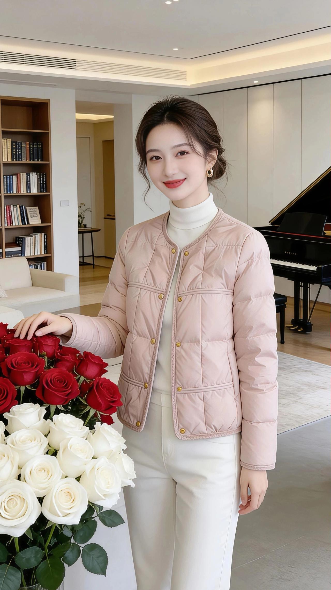 粉绒暖冬,一隅温柔 浅粉色的菱格羽绒外套,像揉碎了的冬日樱花,轻轻裹住肩头,将料峭的寒意隔绝在外。米白高领打底衬得脖颈纤长,搭配着黑色阔腿裤时,是利落的摩登;换了白色裤装,又添几分温婉的柔糯。蓬松的丸子头挽起,几缕碎发垂在颊边,让精致的妆容多了点随性的甜。 她站在敞亮的客厅里,手轻搭在红白茶玫瑰的花束上时,花瓣的柔艳与衣料的软萌相映;指尖触到钢琴黑白琴键的刹那,冷调的雅致又和粉绒的暖融撞出别致韵味。身后的木质书架层层叠叠,书脊的墨色与木纹的暖黄,成了最温柔的背景板。 光线透过落地窗漫进来,在羽绒的菱格纹路上投下浅浅的光斑,像是把冬日的暖阳揉进了衣摆。她笑着望向镜头,抬手理理丸子头,或是轻触书架的书脊,每一个动作都似在与这方空间的温柔相拥。这一隅的美好,是粉绒外套裹住的暖,是花与琴与书织就的柔,也是冬日里,最熨帖的人间小美好。 高级感穿搭 休闲穿搭 冬季穿搭 小个子穿搭