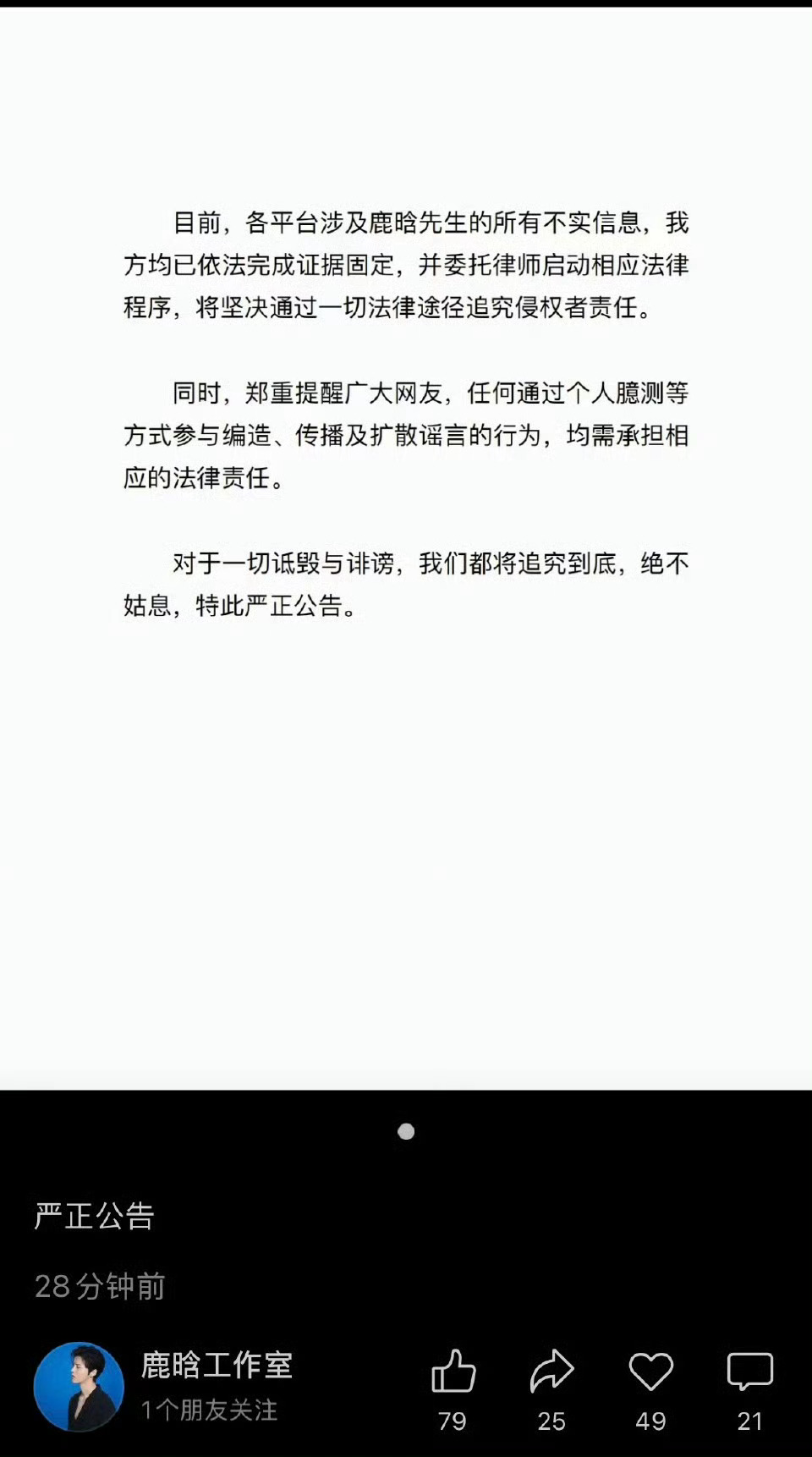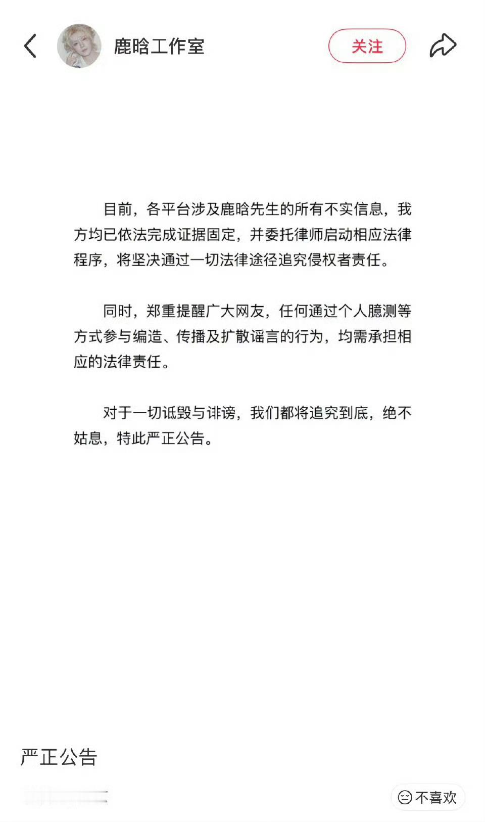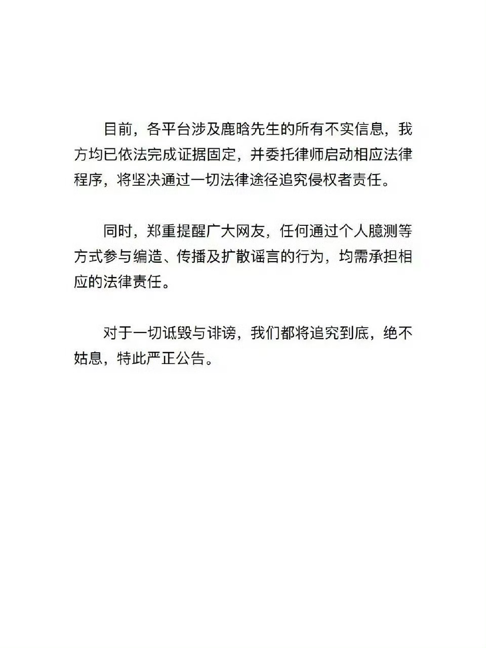 鹿晗方在所有平台都发了辟谣声明鹿晗方辟谣网传合照