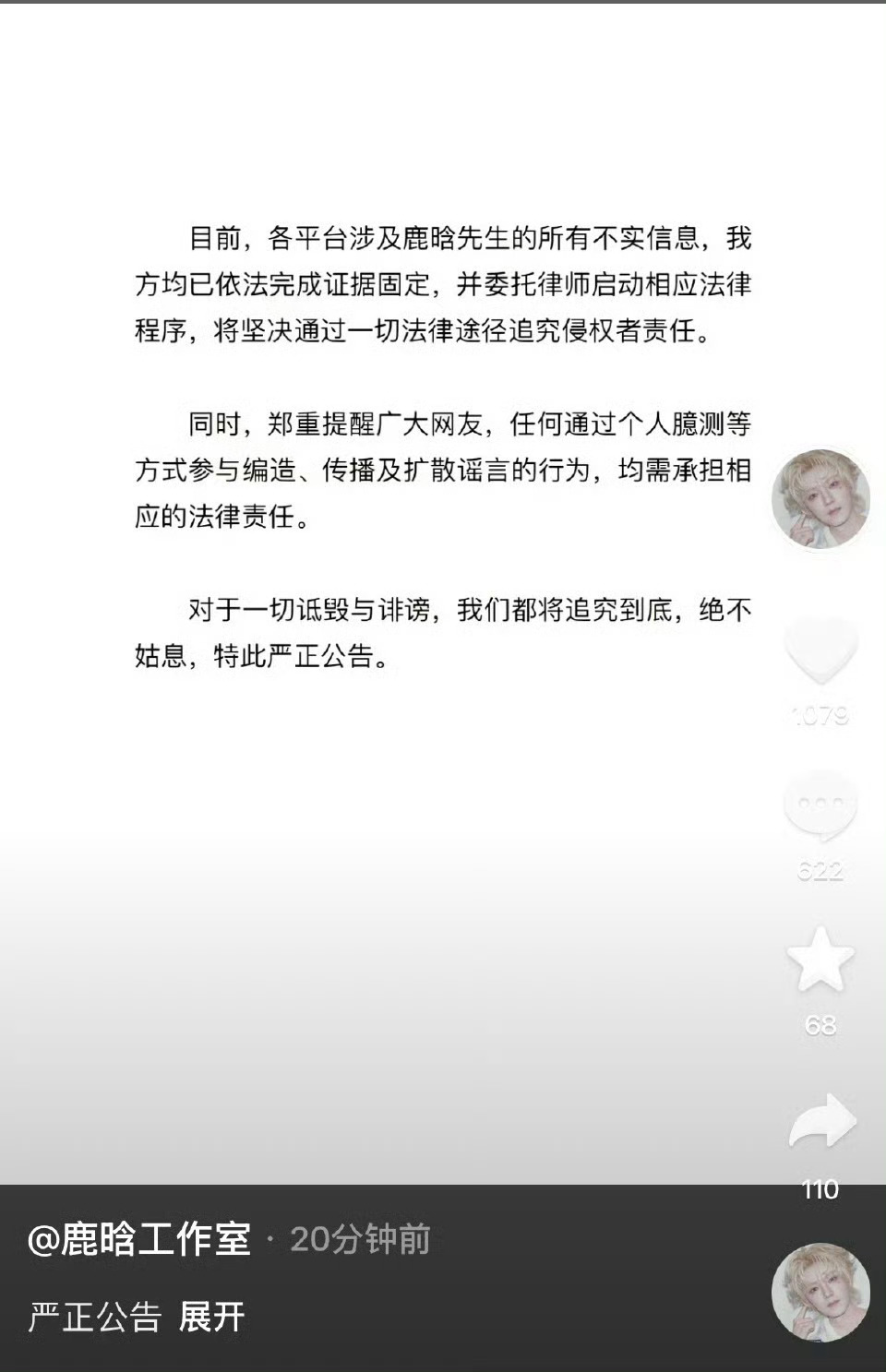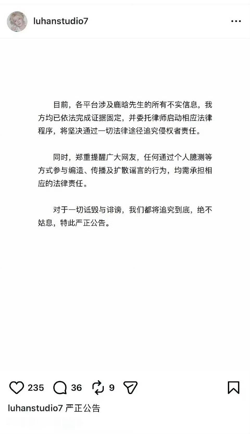 1月3日,一觉醒来,内娱乱成一锅粥一大早鹿晗工作室就发文回应,将严肃处理造谣侵