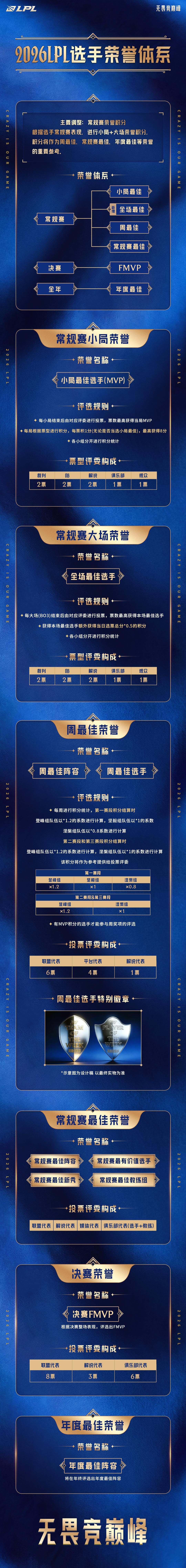 虎扑01月03日讯今日LPL发布2026LPL选手荣誉体系调整,具体如下: