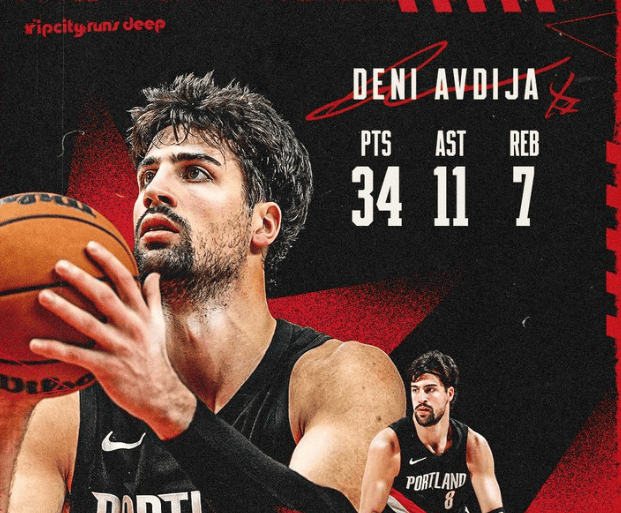本场比赛,开拓者球员德尼-阿夫迪亚出战38分钟,19投10中,其中三分球5投3中,罚球14投11中,得到34分7篮板11助攻1抢断1封盖。