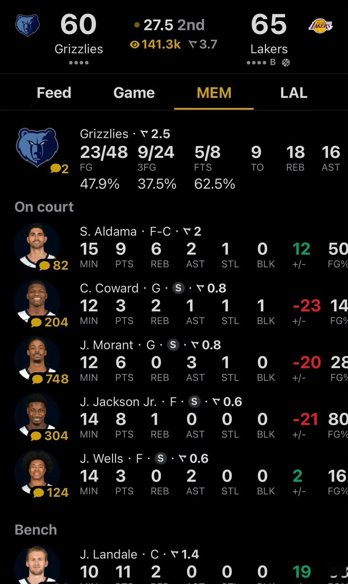 半场结束,湖人66-60灰熊,湖人替补打得太差了,还是防守问题。替补得分湖人13-37灰熊。灰熊要赢球就让替补多打。 莫兰特赶紧卖掉吧,打得太差了。本来老奶奶带着一群替补打了湖人一个18-0,莫兰特回来就输回去了。 湖人队进攻一度陷入僵局,还是靠詹姆斯扭转局面,老詹半场17分6板3助攻3失误,打得不错。 所以说湖人输球的受益者是詹姆斯,只有这样,他才有机会获得更高薪资的签约啊。