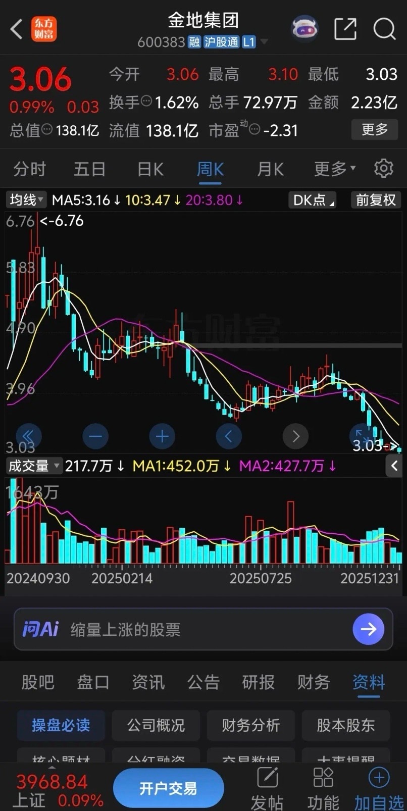金地集团跌的太惨了,2025年暴跌30.14%,市净率跌的仅仅剩下0.25,A股没一个股票比金地集团更低的,最近连续暴跌3个月股价直逼3.00关口,不仅创2025牛市新低,把整个9.24以来的牛市涨幅全部跌没了,离24年7月最恐慌的低点仅一步之遥,这一年多来政策利好非常多,可是金地集团真正大涨只有24年9.24那一波,后来的利好金地集团都无动于衷,不断的震荡下跌,不断的把股民意志磨灭,不少股民忍不住还是割肉了,总体上看股价已经跌到上市25年以来最低价,即使前复权股价也已经回到10年前,这么算起来前些年房地产轰轰烈烈股民也是一场空,近10年买入的股民基本上被套了,惨不忍睹。