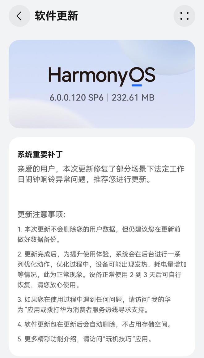 IT之家注意到,昨日已经有部分机型收到了鸿蒙6.0.0.120SP6更新,主要内容为优化了系统使用体验。