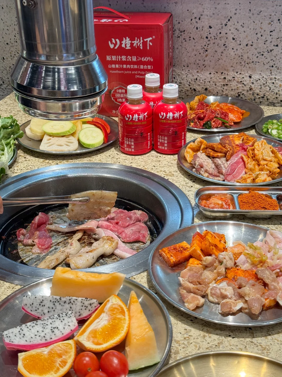 天冷了,当然要吃烤肉啦 炭火一升,五花肉、肥牛卷轮番上阵,裹满孜然和辣椒粉的瞬间,香到迷糊🤤 好吃是好吃,就是吃多了容易腻得慌 幸亏提前准备好了山楂树下山楂果汁,解腻超合适~ 开盖就闻到浓郁的天然山楂香 入口就是恰到好处的酸甜感,清爽又不齁 顺着喉咙滑下去,满口清爽感,腻味一下子就缓解了 嘴里都是山楂味,原料选的是水果黄金种植带的铁山楂,口感很正 , 冰冰凉凉的喝一口,又能接着炫肉,烤肉局的正确打开方式又轻松get到了