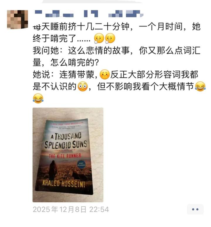 这本书是妈妈推荐给她的。她利用每天睡前十几二十分钟的碎片时间,花了一个多月,终于把这本英文小说“啃”完了。诗怡妈妈还特地发了条朋友圈,分享女儿连猜带蒙看小说的趣事。