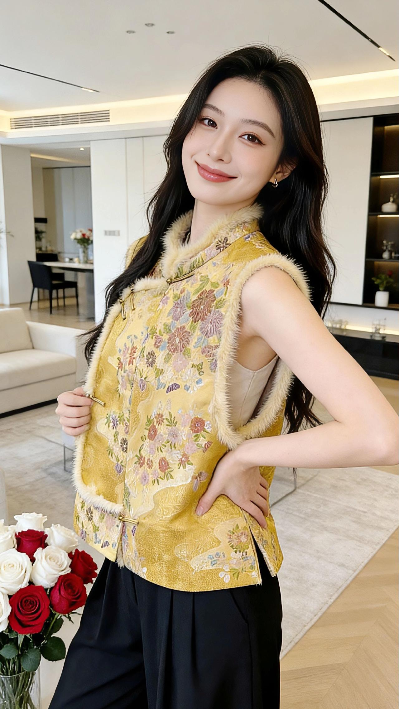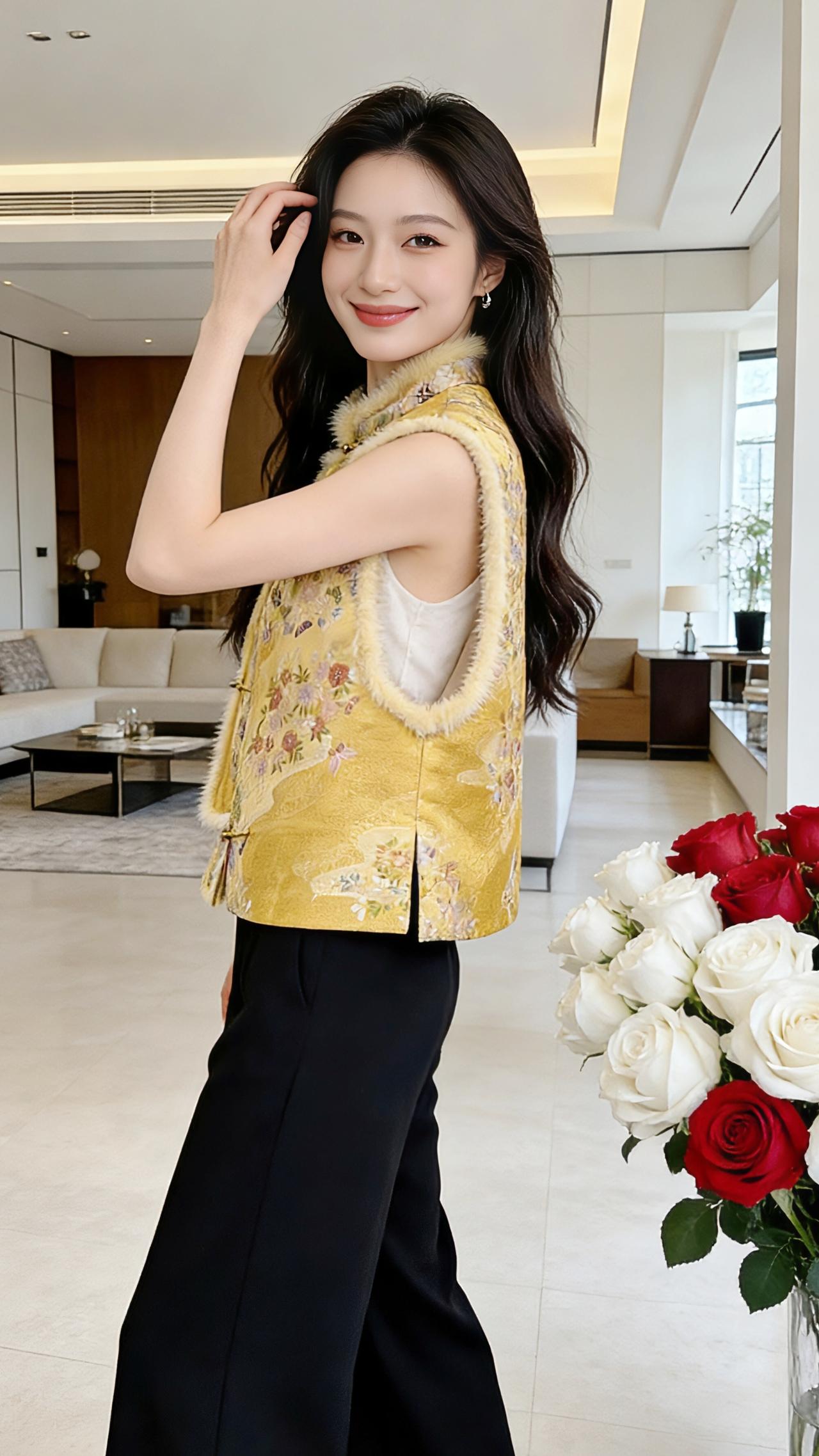 金蕊锦裳 暖黄的锦缎马甲似揉了初冬的暖阳,织金的花纹缠枝绕叶,晕开几分古典的温婉。滚边的软毛轻拂着肩头,像拢了一捧蓬松的云,中式盘扣在衣襟处轻轻叩合,将东方的雅致凝在方寸之间。 黑发垂落肩头,腕间轻抬,指尖触到领口的刹那,仿佛触到了时光里的锦绣风华。黑裤的利落中和了锦缎的柔婉,现代的廓形与古韵的纹样相融,恰似新雪落于古梅枝,冷冽里藏着温柔的香。 身旁的玫瑰开得热烈,红的炽烈,白的清润,与马甲的金黄相映,像把人间的盛景都揉进了这一方天地。她立在简约的居室里,笑意浅浅,中式的韵致便在这一笑间,漫成了温柔的河。 高级感穿搭 中式风穿搭