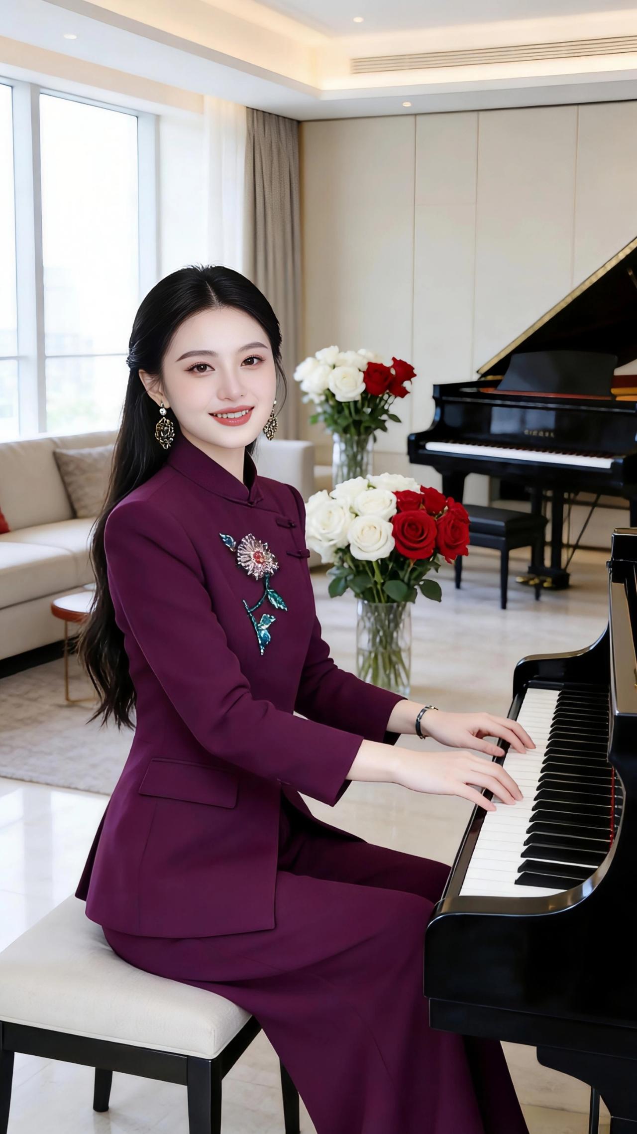 紫韵琴声 深紫的中式西装裹着一身雅致,立领盘扣揉着西式剪裁的利落,像把东方的温婉与西方的飒爽拧成了一缕琴音。胸间的花饰凝着珠光,似从江南烟雨里摘来的梅,落在绛紫的衣料上,便成了无声的韵脚。 她坐在三角钢琴前,指尖未触琴键,周遭却似已有乐声流淌。黑白琴键在暖光里泛着柔光,身旁的红白玫瑰拥着玻璃花瓶,花瓣的柔润与钢琴的冷硬撞出温柔的张力。转身时,阔腿裤摆扫过光洁的大理石地面,步履轻缓,却踩碎了一室的静谧;抬手拢发的瞬间,耳坠的碎光晃了晃,恰如琴键上跃动的音符。 倚着钢琴时,指尖搭在琴沿,像是触到了一段未弹的旋律;斜靠沙发的刹那,绛紫衣摆垂落,又似将一室的优雅都收进了衣褶里。窗外的天光漫进来,落在她发梢,落在琴身,落在那束盛放的玫瑰上,时光也跟着慢了下来,只余下紫调的温柔与琴音的余韵,在这方空间里轻轻绕。 高级感穿搭 新年穿搭 新中式穿搭 职业套装