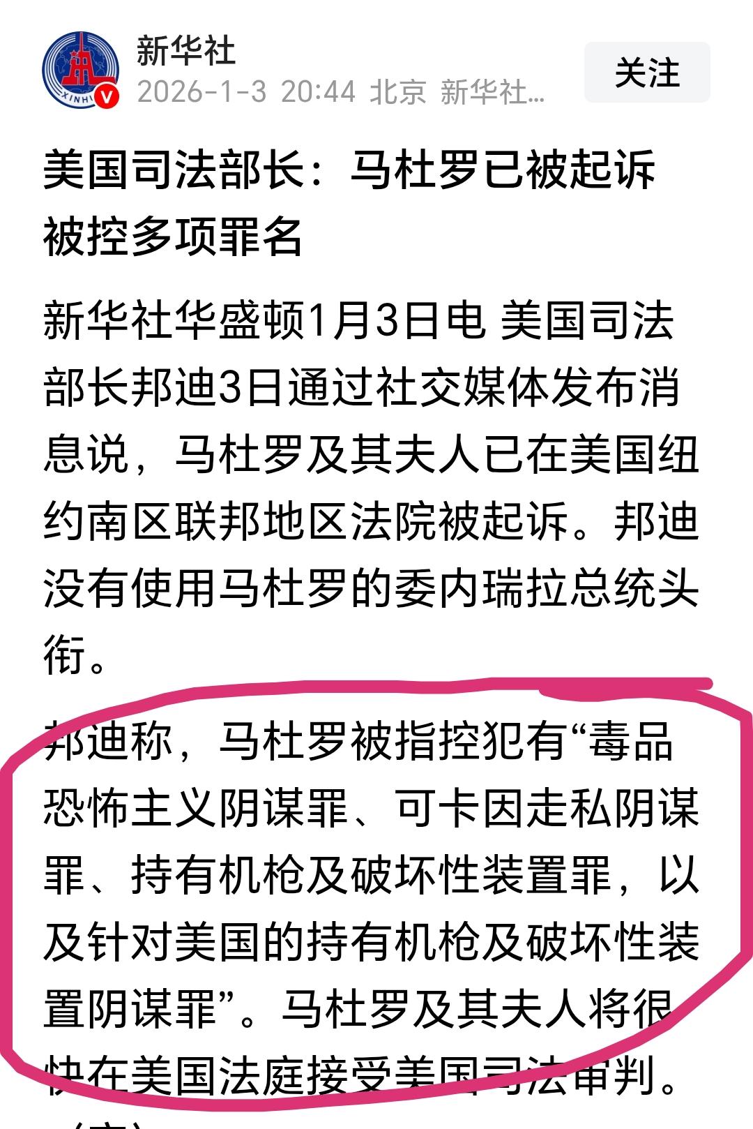 美国给马杜罗安的这罪名也是绝了,针对美国持有机枪和破坏性装置阴谋罪。 来抓我呀,我也有。 我现在就在针对美国,我的手机发送我的言论就是对美国有破坏性装置,来抓我呀。 耍流氓就流氓嘛,大家都知道你是流氓了还要装圣人,真小人叠加伪君子,比真小人还要让人恶心一万倍。 我想看看之前对我们军演瞎逼逼的那些国家会不会第一时间出来谴责美国的侵略行为。 我想看看那些曾经谴责俄罗斯并高呼乌克兰必胜的人,这次会不会以同样声量谴责美国并高呼委内瑞拉必胜。 我相信肯定不会。 这就是这个世界的真相。 点右上角关注我,我们一起去看这个魔幻的世界