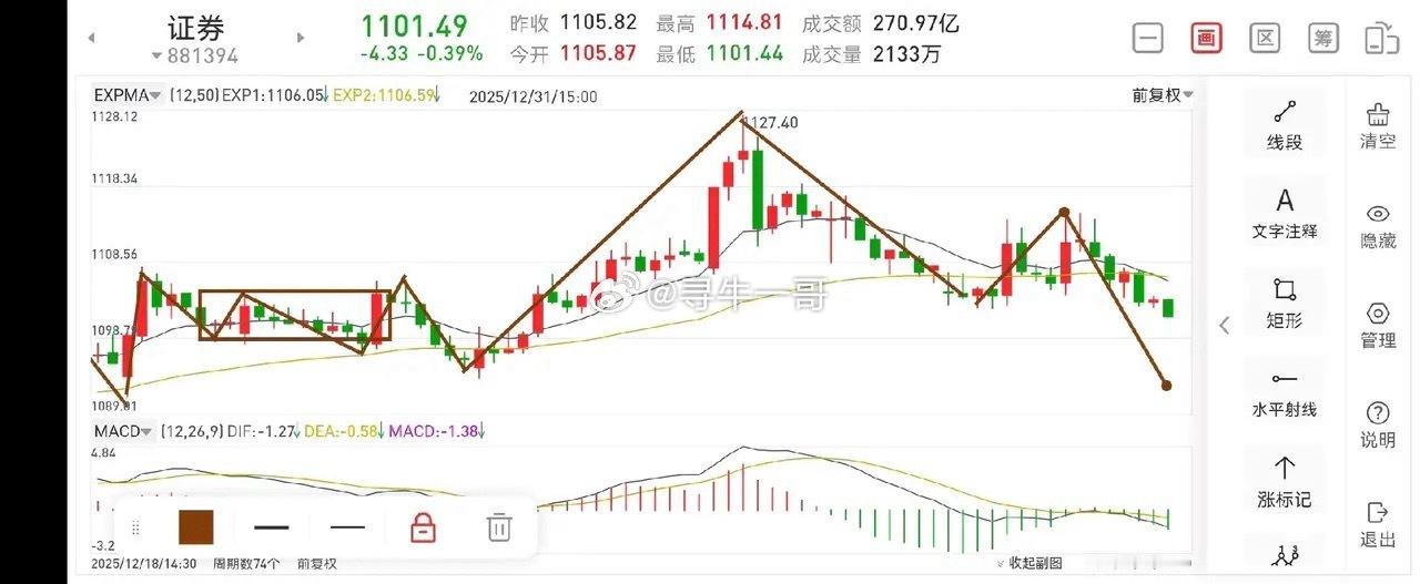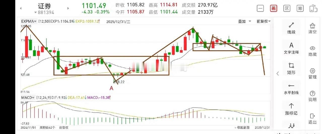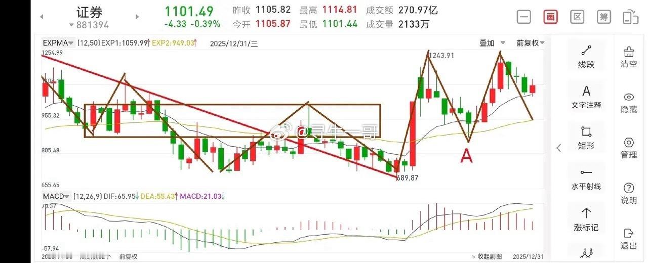 下周证券板块展望(2026.1.3)2025年证券板块表现虽不尽如意,但已呈现顶底都在抬高的格局,所以大趋势向上是毋庸置疑的,在操作上需保持足够的耐心才行,毕竟股市是少数人盈利的游戏,即便是在牛市,这样的游戏规则也不会被打破,只要耐得住寂寞,那么繁花总会盛开。1.从季线图一上看,在形成季线二买A点后,目前正在逐步向上走离开段,大家都知道,二买往往是该级别主升浪的开始,所以这是季线级别的主升行情,破历史最高点是迟早的事。2.从月线图二上看,在形成月线二买A点后,目前正在走延伸回踩月线一笔,由此构建一个月线上涨中枢,待构建完成后,将会发动一波上涨行情,但上涨从来不是一蹴而就的,后面还要构建周线二买和日线二买的构建,所以这就是政策所引导的慢牛走势。是非常适合波段操作的。3.从周线图三上看,目前已经构建完成了一个周线下跌趋势,这个中枢是由二个同方向的日线中枢有重叠所构成的,现在正在走离开段,所以从该级别上目前是看空的。4.从日线图四上看,目前正在回踩日线一笔,这笔回踩远没有结束,现在只是才刚刚开始,所以现在捏住手中现金才是最重要的,等可以介入布局时,我也会做出友情提醒。5.从30分钟图五上看,目前正在回踩30分钟一笔,回踩还意犹未尽,短期仍将是以缓慢震荡下行为主,宜空仓观望为主。6.从5分钟图六上看,目前绿柱正在逐步缩小,此处有5分钟一笔的反弹技术需求,所以下周一有望迎来开门红,但反弹高度有限,总体仍旧会继续下行,所以此处没有多大的操作意义。总之,大方向调整并没有结束,布局机会还没到来,还需耐心等待。证券板块解析a股今日看盘
