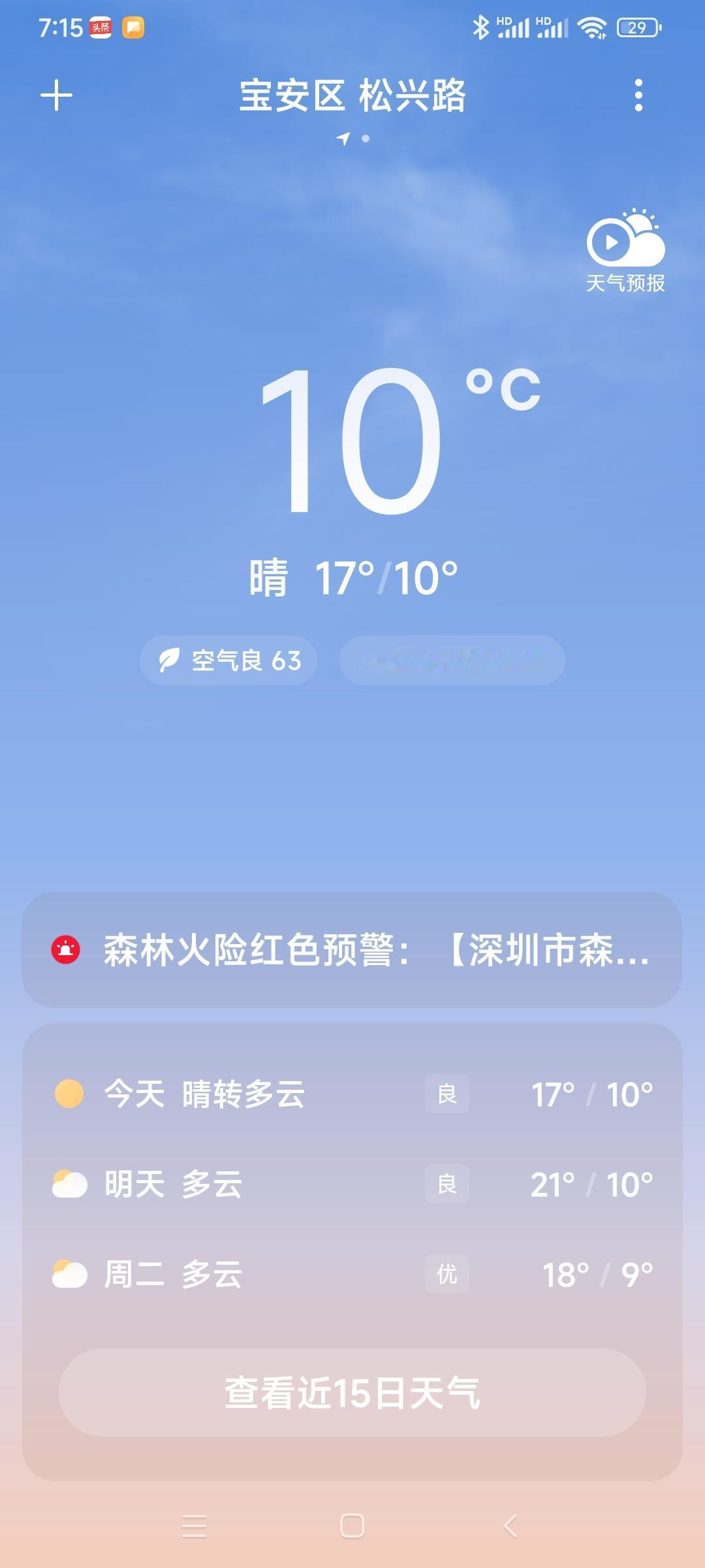 我的今日状态:😁轻松愉快 我这里的天气:☀️晴天,深圳今日晴转多云,气温10度