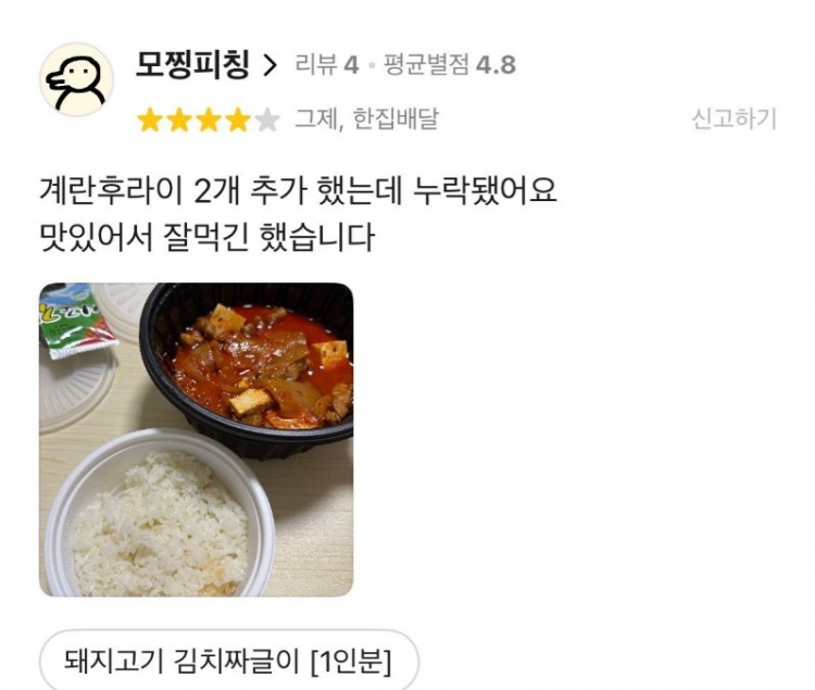 昨天我点了什么来着…?我点了炖泡菜,炖泡菜通常会配煎蛋嘛,所以我额外加了两颗荷包蛋,结果荷包蛋居然没有送来…但是打电话去店家又觉得怪怪的,所以就想着“啊,这群人不行啊,竟然把荷包蛋漏掉?”本来我想冷酷地给低分评价,但…实在是太好吃了,所以我最后给了几颗星呢?给了几颗星呢?原本想给两颗星,但最后“协商”过后给了四颗星,就是这样一个小插曲啦。