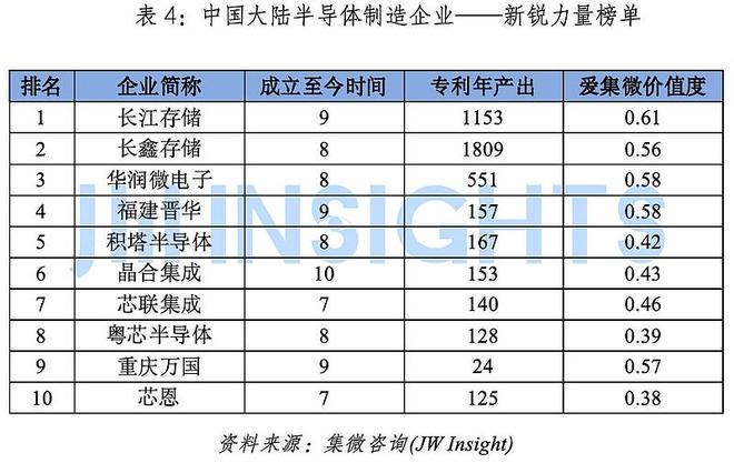 针对成立于近10年内的半导体制造企业,综合企业专利年产出量、专利价值度等多维度数据,爱集微知识产权咨询发布新锐力量企业十强榜单。
