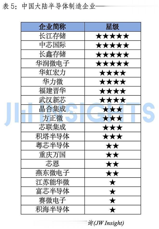 中国大陆半导体制造企业——爱集微星级榜单