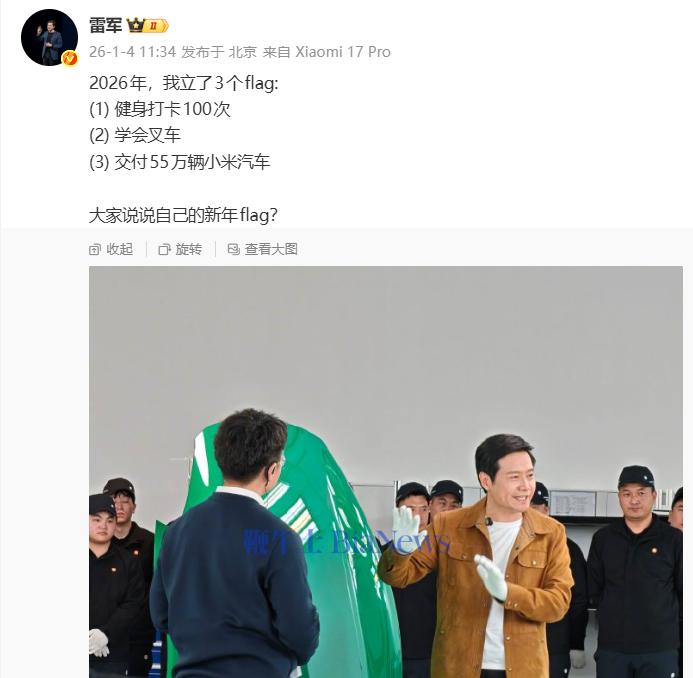今日,小米汽车董事长雷军发文称2026年,他立了3个flag。