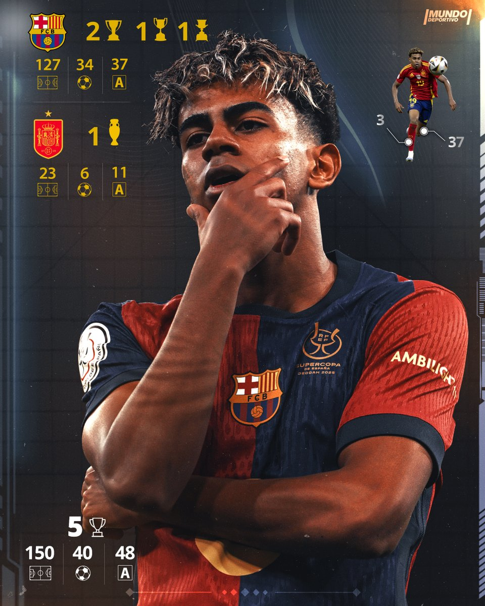 据西班牙媒体《世界体育报》赛后的统计,18岁亚马尔达成职业生涯150场比赛里程碑,其中巴萨127场34球37助,西班牙队23场6球11助。