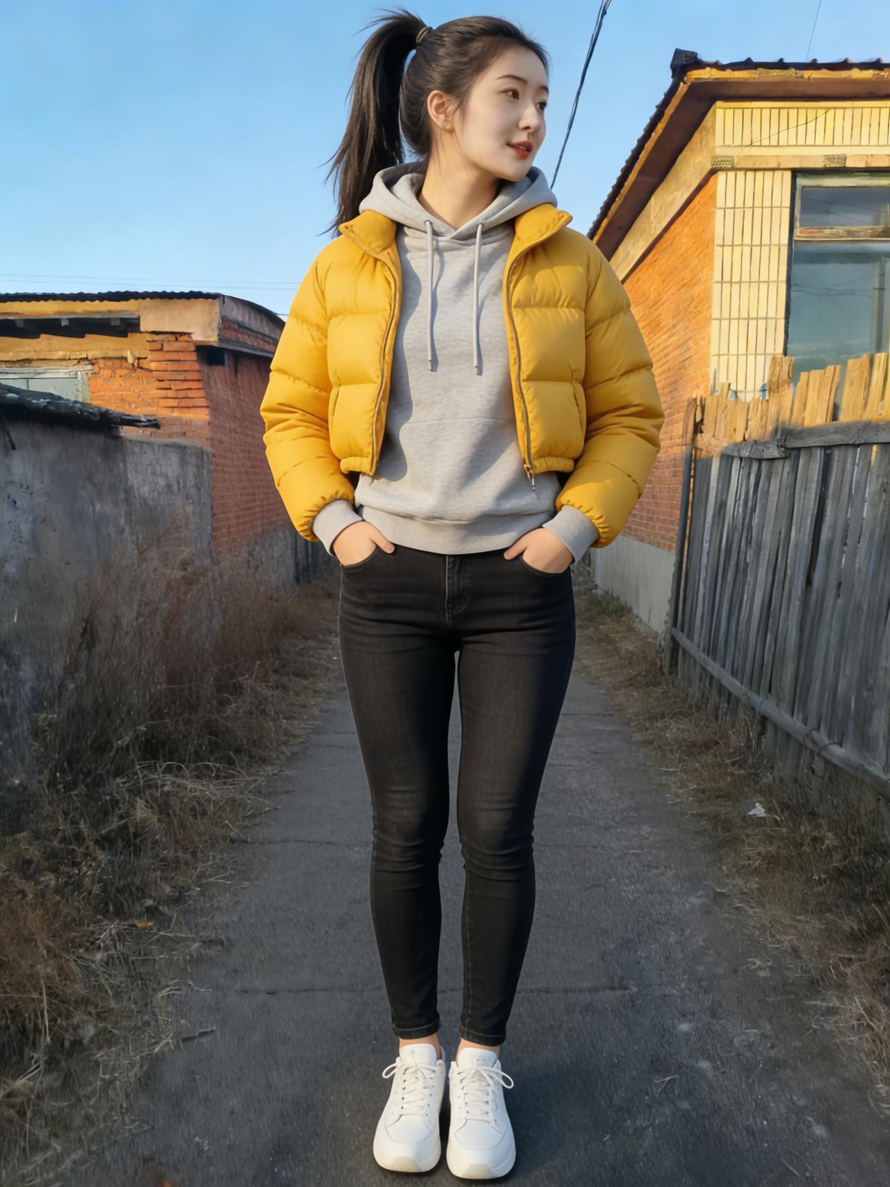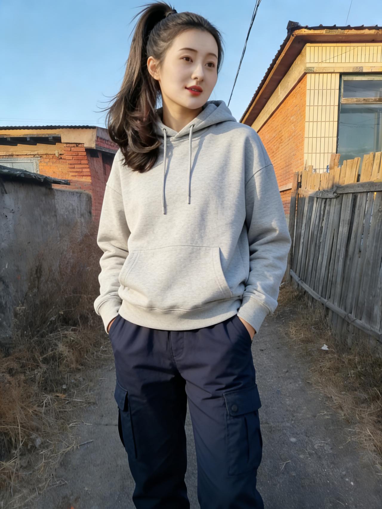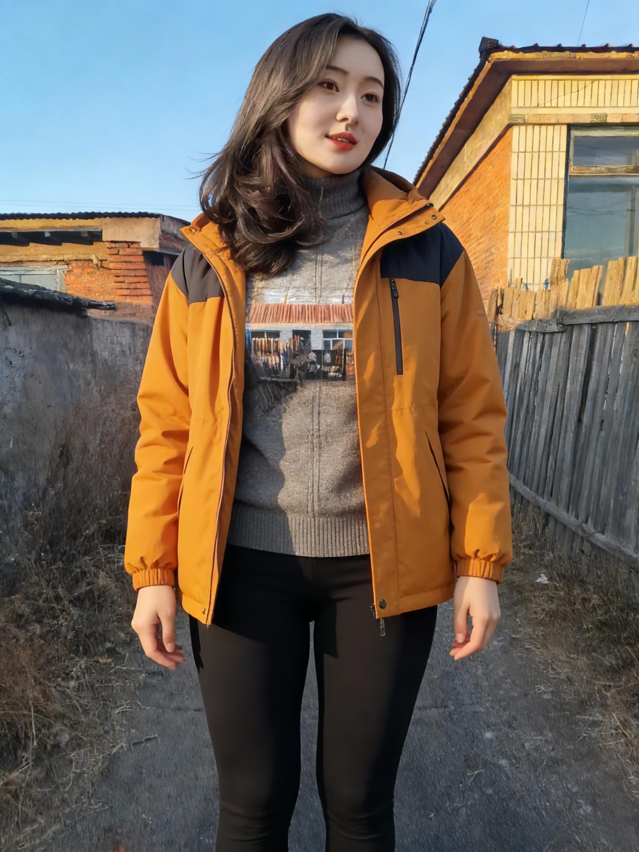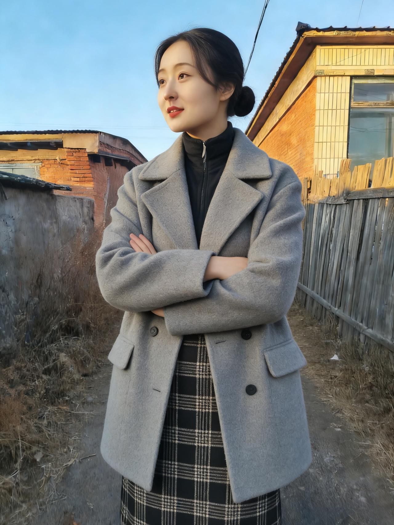 黄衫斜立野村头,木栅疏疏映晚秋。 红缀衣衿凝晓日,褐铺垣壁带霜愁。 风飘鬓发随云远,目断天涯逐水流。 荒草漫途迷故径,遥天垂影入平畴。 身著工装藏远志,心随归雁起沧洲。 何须叹惜乡关僻,自有豪情贯斗牛。