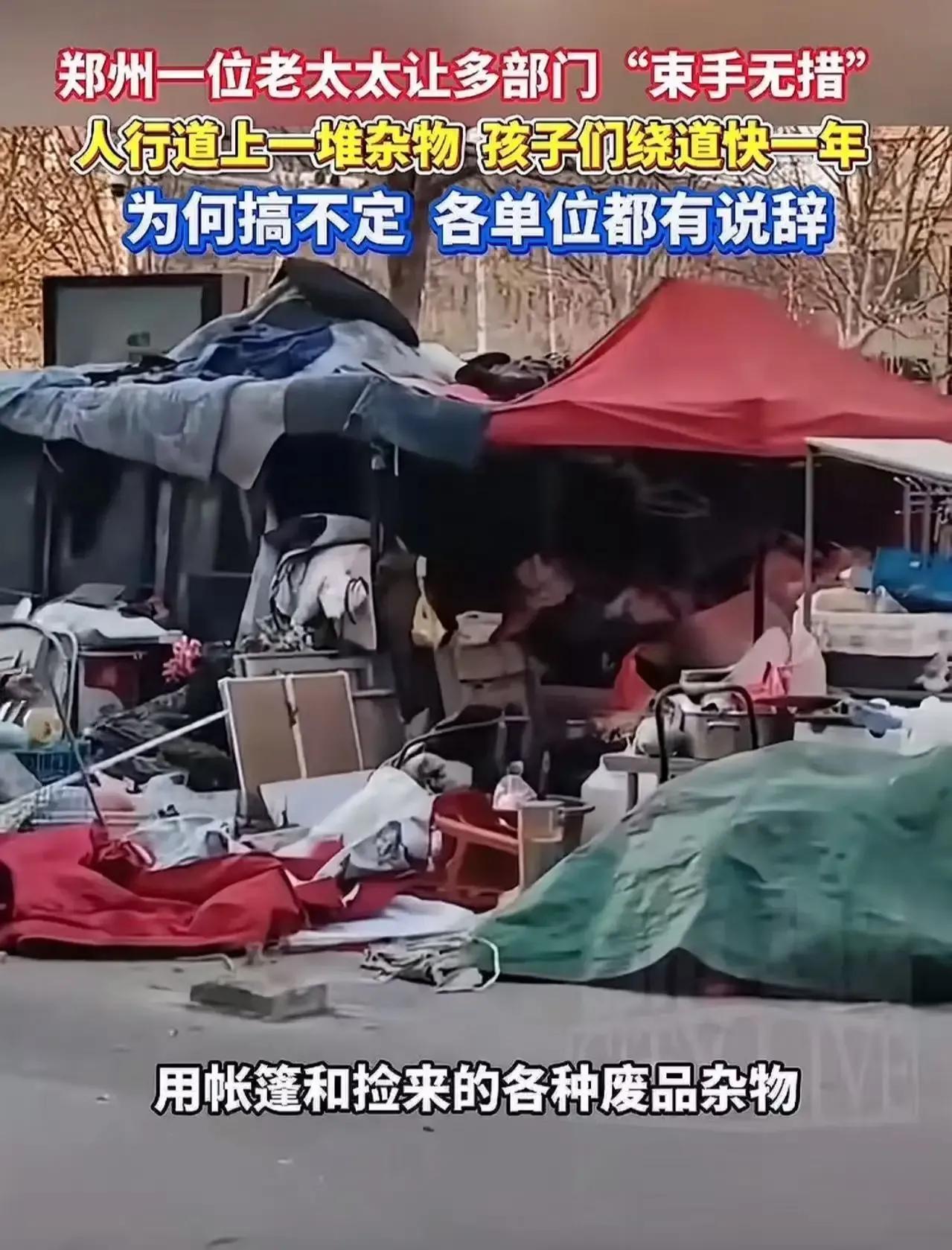 郑州有位老太太,竟然让多个部门都束手无策,这是怎么回事呢?她用帐篷和废品长期占据小区外人行道,居民多次投诉却无人敢管,这背后究竟有何隐情? 据了解,这位老太太在小区外的人行道上搭起了帐篷,还堆满了捡来的各种废品杂物,严重影响了居民的出行和市容市貌。小区居民多次向相关部门投诉,但得到的回应却是有关部门不敢管。原来,执法部门表示,这位老人情况特殊,有精神问题,年纪也大了,如果采取强制措施可能会引发不必要的麻烦,因此只能慢慢协调解决。这一说法引发了网友们的热议,有人认为执法部门应该更加人性化,考虑老人的实际情况;也有人认为,不能因为老人有精神问题就放任其影响公共秩序,应该寻求更加妥善的解决方案。毕竟,公共秩序是大家共同维护的,不能因为个别人的特殊情况就有所妥协。 这起事件确实让人头疼,执法部门在面对特殊情况时也需要权衡利弊。大家觉得应该如何处理这件事呢?快来评论区留下你的看法,一起探讨如何平衡人情与法理!郑州社区质问