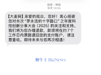 信息显示,大麦网:亲爱的观众,您好!衷心感谢您对本次“罗永浩的十字路口”之年度科技创新分享大会(2025)的关注和支持,我们将为您办理退款,款项将在约7个工作日内原路退回您的支付账户,请注意查收。期待未来与您再次相遇!