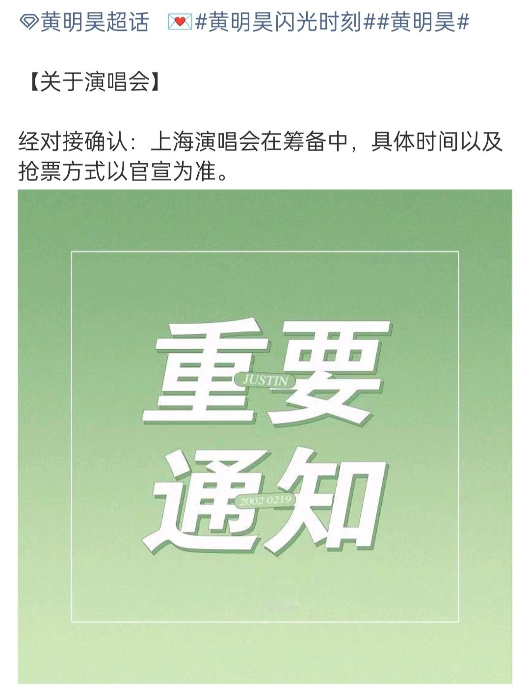 黄明昊上海演唱会在筹备中黄明昊对接确认:上海演唱会在筹备中,具体时间以及抢票方式