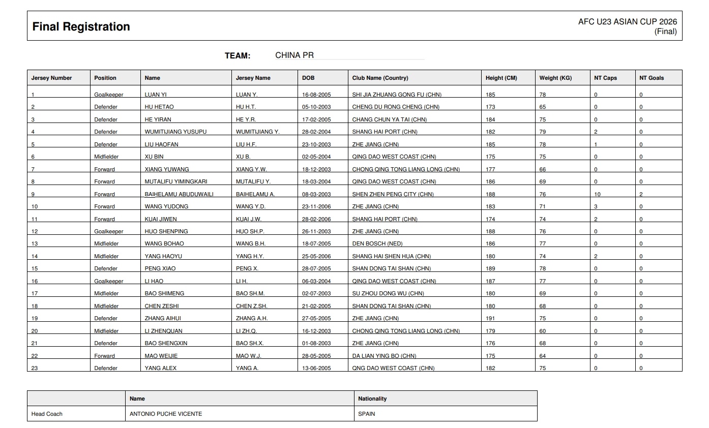按照亚足联相关规定,参加第7届U23亚洲杯赛的各支球队每队至多报名23名球员。共有27名球员参加了中国U23队近期在阿联酋的拉练,全队已于当地时间1月3日下午抵达U23亚洲杯比赛地沙特利雅得,所有集训球员均随队同行。从亚足联方面传递的信息来看,中国足协已经上报了U23国足的23人参赛报名单,姚浩洋、张一轩、依木兰、朱鹏宇等4人落选。