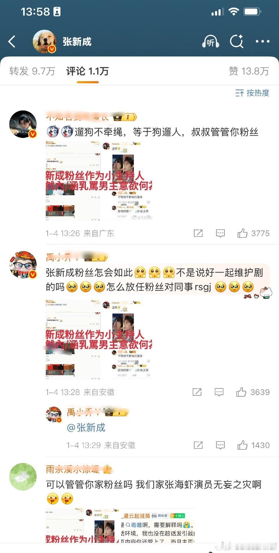 丁禹兮 粉丝到张新成 的博下刷评了这种情况真的特别败好感,粉丝的口舌之争干嘛跑去正主那里