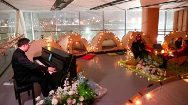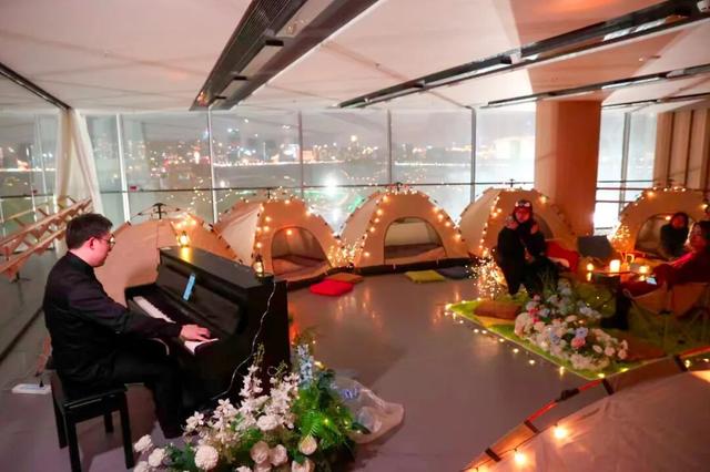 在排练厅内,钢琴师的指尖流淌出舒缓的旋律,德彪西的《月光》婉转悠扬,《遇见》《RememberMe》等经典影视金曲轻柔回响。“这是一场午夜的专属音乐会,选曲要贴合安静温柔的氛围。”钢琴师笑着说。窗外江风阵阵,室内琴声袅袅,观众或坐在露营椅上闭目聆听,或钻进帐篷轻声交谈,惬意又自在。