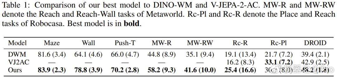 在与DINO-WM和V-JEPA-2-AC的直接较量中,该模型在几乎所有维度上均取得了领先。