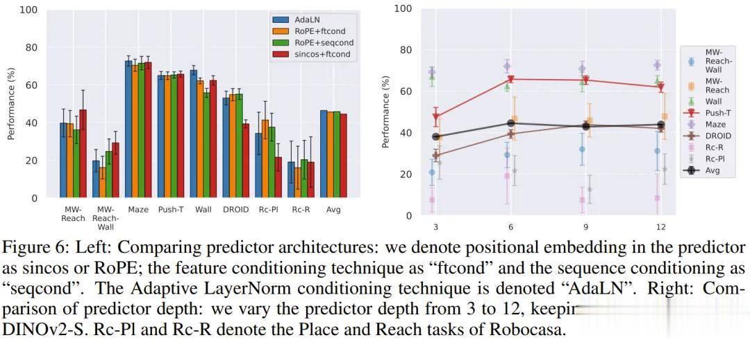 研究最终汇总所有洞察,提出了针对不同任务的最优配置:在模拟器中使用ViT-S配以AdaLN,而在真实复杂场景中使用DINOv3ViT-L配以12层深度的预测器。