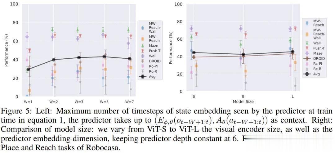 模型规模:这是一个令人意外的发现:在简单的模拟环境(如Maze,Wall)中,增大模型规模(从ViT-S到ViT-L)非但没有帮助,反而可能由于嵌入空间过于复杂而导致规划效率下降。但对于复杂的现实数据(DROID),大容量的编码器和更深的预测器则展现出了明确的正相关收益,说明任务的物理复杂度决定了智能体所需的智力上限。