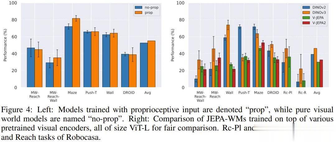 编码器架构:DINO系列编码器(DINOv2/v3)在所有任务中均表现出对V-JEPA等视频编码器的明显优势。这归功于DINO强大的细粒度目标分割能力,这对于需要精确感知物体位置的操纵和导航任务至关重要。在视觉复杂度更高的真实数据(DROID)中,DINOv3的优势进一步扩大。