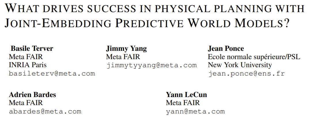 论文标题:WhatDrivesSuccessinPhysicalPlanningwithJoint-EmbeddingPredictiveWorldModels?论文地址:https://arxiv.org/abs/2512.24497