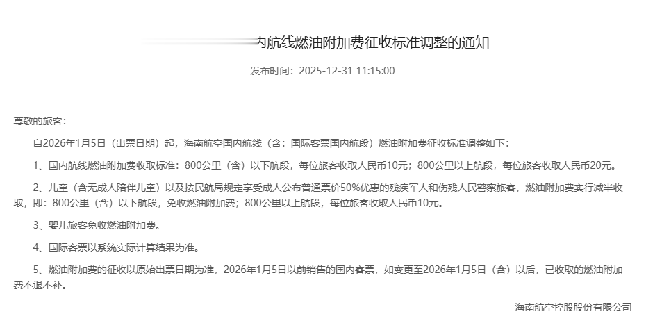 下调国内航线燃油附加费