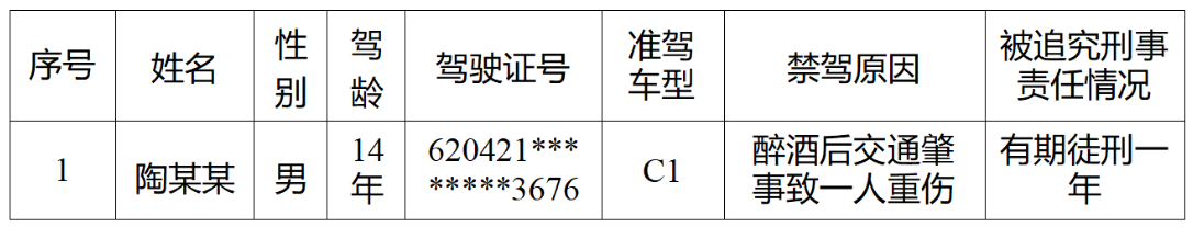 青岛日报社/观海新闻1月4日讯近日,青岛市公安交管部门公布终生禁驾人员名单,1人被终生禁驾。据了解,终生禁驾是一项严厉的行政处罚,意味着驾驶人“终生不得重新考取机动车驾驶证,终生不能驾驶机动车”。目前全国已经实现了交管信息联网,一经处罚,驾驶人信息将录入全国机动车驾驶人管理系统,被锁定为终生禁驾的驾驶人无论在省内还是省外都无法再考取驾驶证。