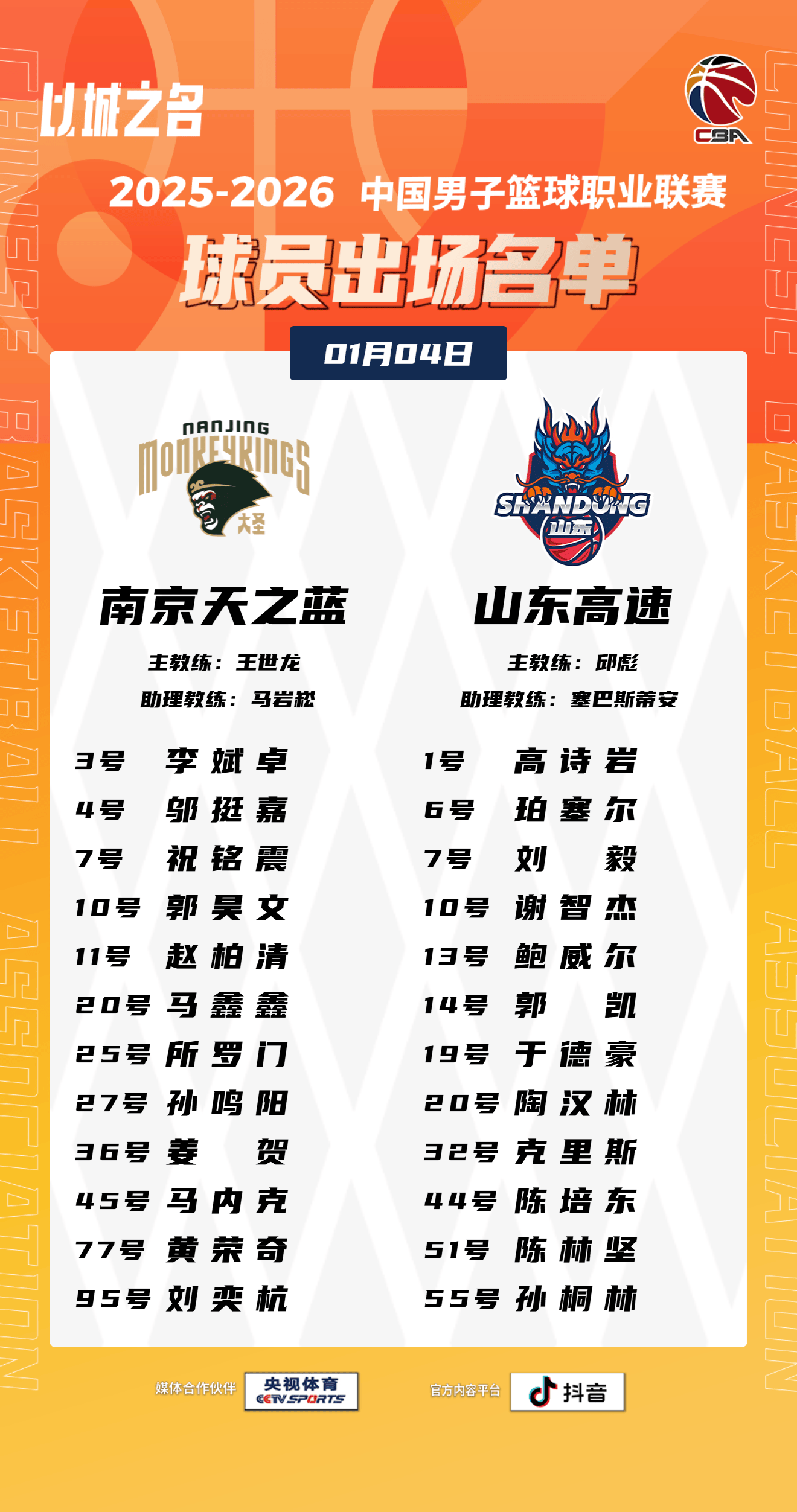 虎扑01月04日讯今日CBA常规赛,南京对阵山东的大名单已经公布。