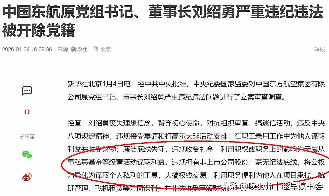 东航董事长刘绍勇被开除党籍,航空安全背后警示录 2026年1月4日,中央纪委国家监委通报, 中国东方航空集团有限公司原董事长刘绍勇被开除党籍,其涉嫌犯罪问题已移送检察机关。这位执掌东航14年的“老民航”因严重违纪违法倒下了。 通报揭露其核心问题直指航空业命脉:在项目承揽、航班管理、飞机租赁等关键领域为他人谋利,非法收受巨额财物。这意味着从基建采购到日常航班运行,潜在的利益输送可能渗透多个环节。 尽管专业调查确认MU5735事故原因复杂且罕见,未指向组织管理,但高管的权力寻租行为侵蚀企业健康肌体,长期而言必然损害安全文化根基。廉洁的经营管理,与每一架飞机的起降安全息息相关。 当前司法程序已启动,此案成为航空业强化内部治理、切断利益链的鲜明信号。确保蓝天之上的安全,必须从清除地面上的腐败开始。