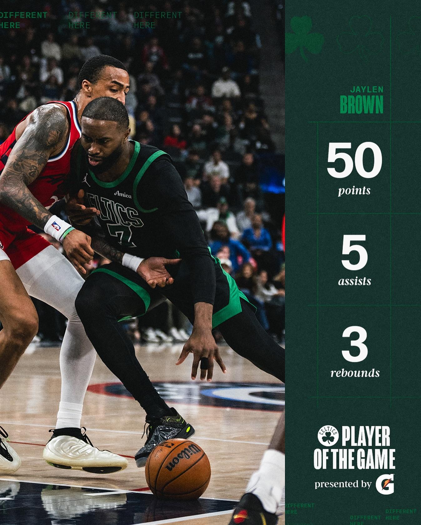 本场比赛,杰伦-布朗出场35分钟,得到50分3篮板5助攻,投篮26中18,三分10中6。