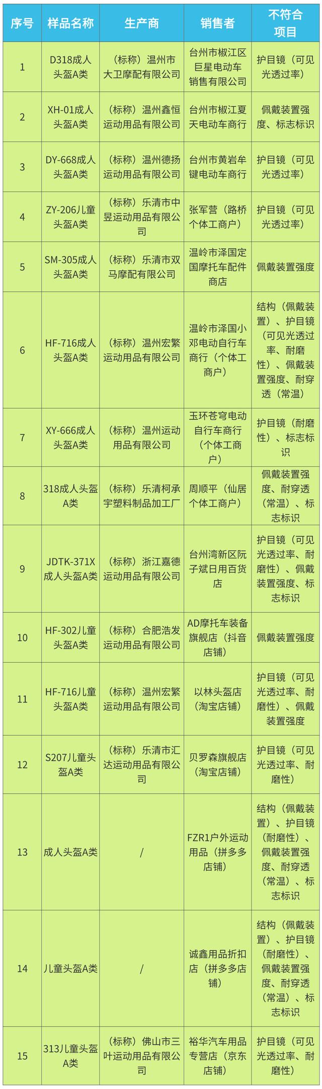 据介绍,本次比较试验的25款样品均为A类头盔,包括15款成人头盔和10款儿童头盔。测试结果显示,在15款不达标样品中,成人头盔占9款,儿童头盔占6款。不达标项目主要集中在护目镜、佩戴装置强度、标志标识、耐穿透和结构等5个方面。