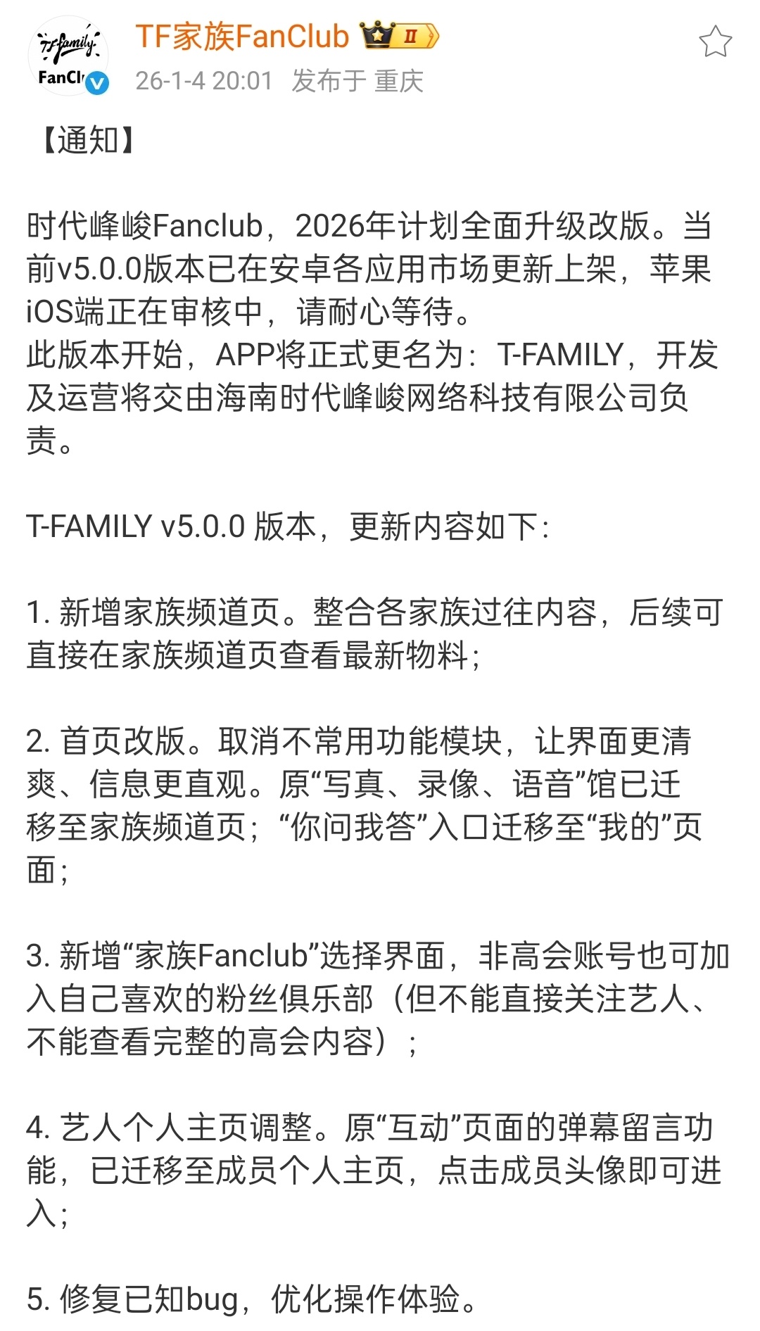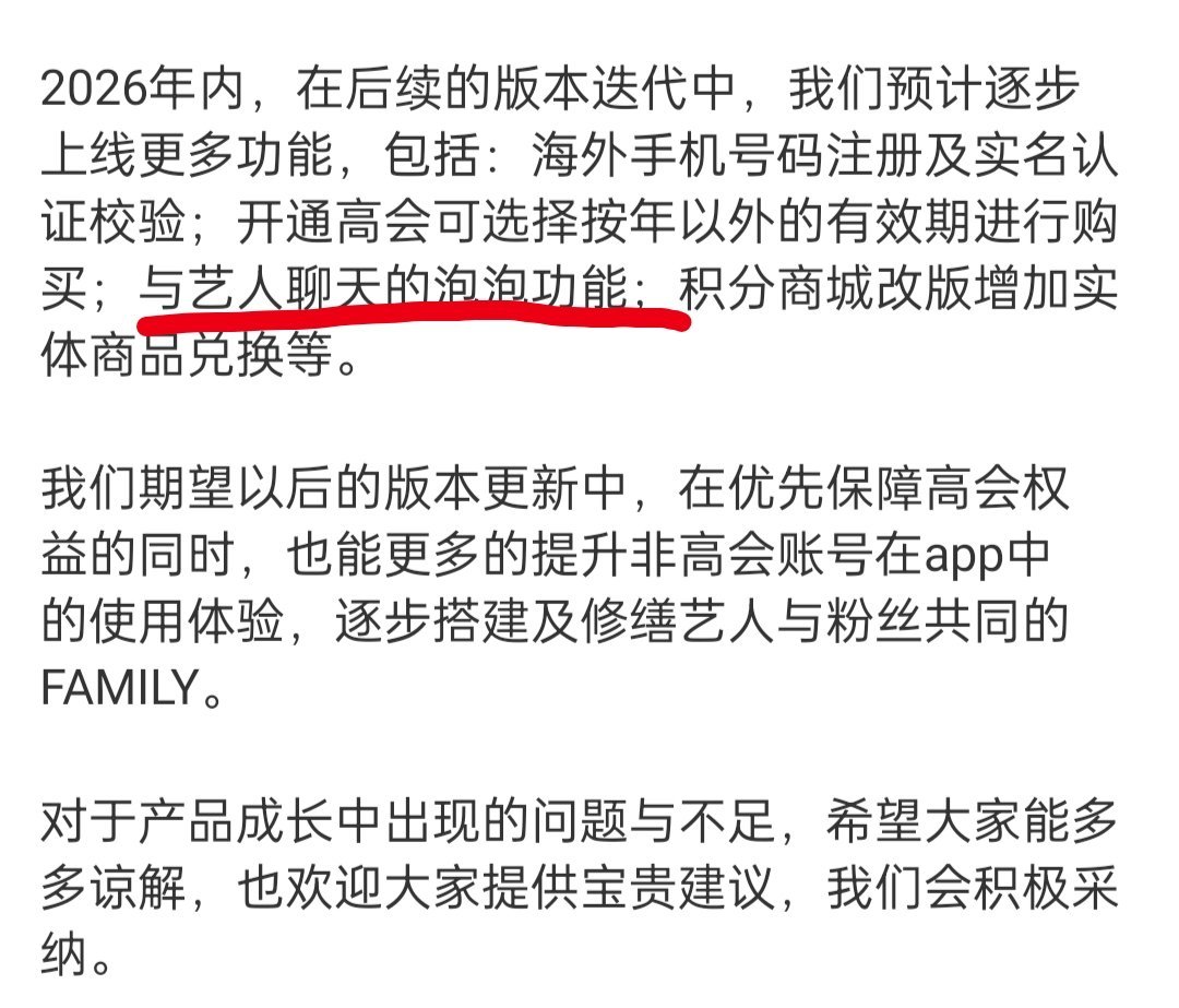 高会将开通泡泡功能时代峰峻Fanclub2026升级改版通知🈶新增家族频道页与“家族Fanclub”选择界面!非高会账号也可加入自己喜欢的粉丝俱乐部!26年内逐步上线【与艺人聊天的泡泡功能】高会升级改版通知 时代峰峻高会 泡泡