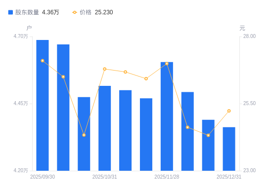 日期A股户数(户)流通A股户均持股数(股)户均持股市值(万元)2025-12-31436209962.7125.142025-12-19438979899.8524.082025-12-10449339671.5923.812025-11-28460509436.9925.472025-11-20446979722.6525.702025-11-10450019656.9725.762025-10-31451619622.7625.782025-10-20447439712.6623.632025-10-10467059304.6524.662025-09-30468709271.8925.13