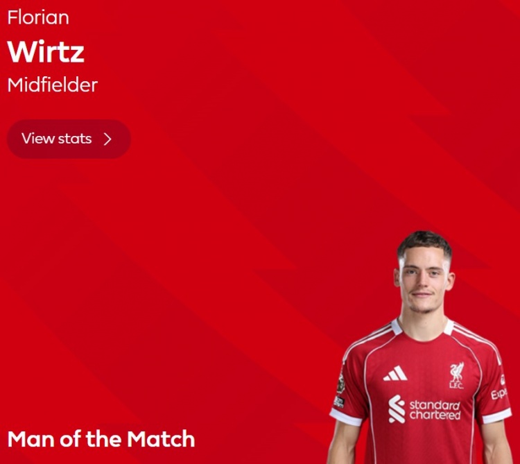 英超生涯第2球,英超官方:维尔茨当选利物浦2-2富勒姆全场最佳