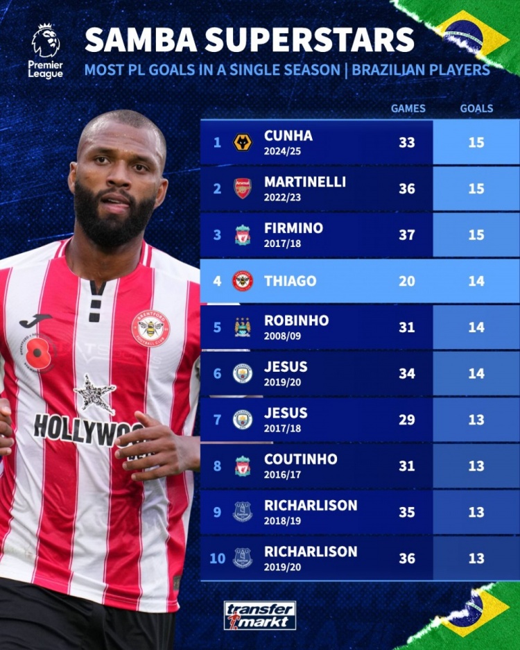 直播吧1月5日讯布伦特福德在本轮英超4-2击败埃弗顿,伊戈尔·蒂亚戈戴帽。数据统计显示他距离英超单赛季巴西射手王仅一步之遥。
